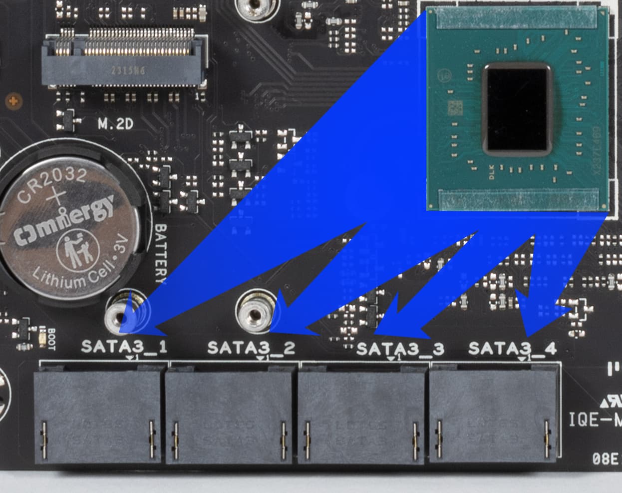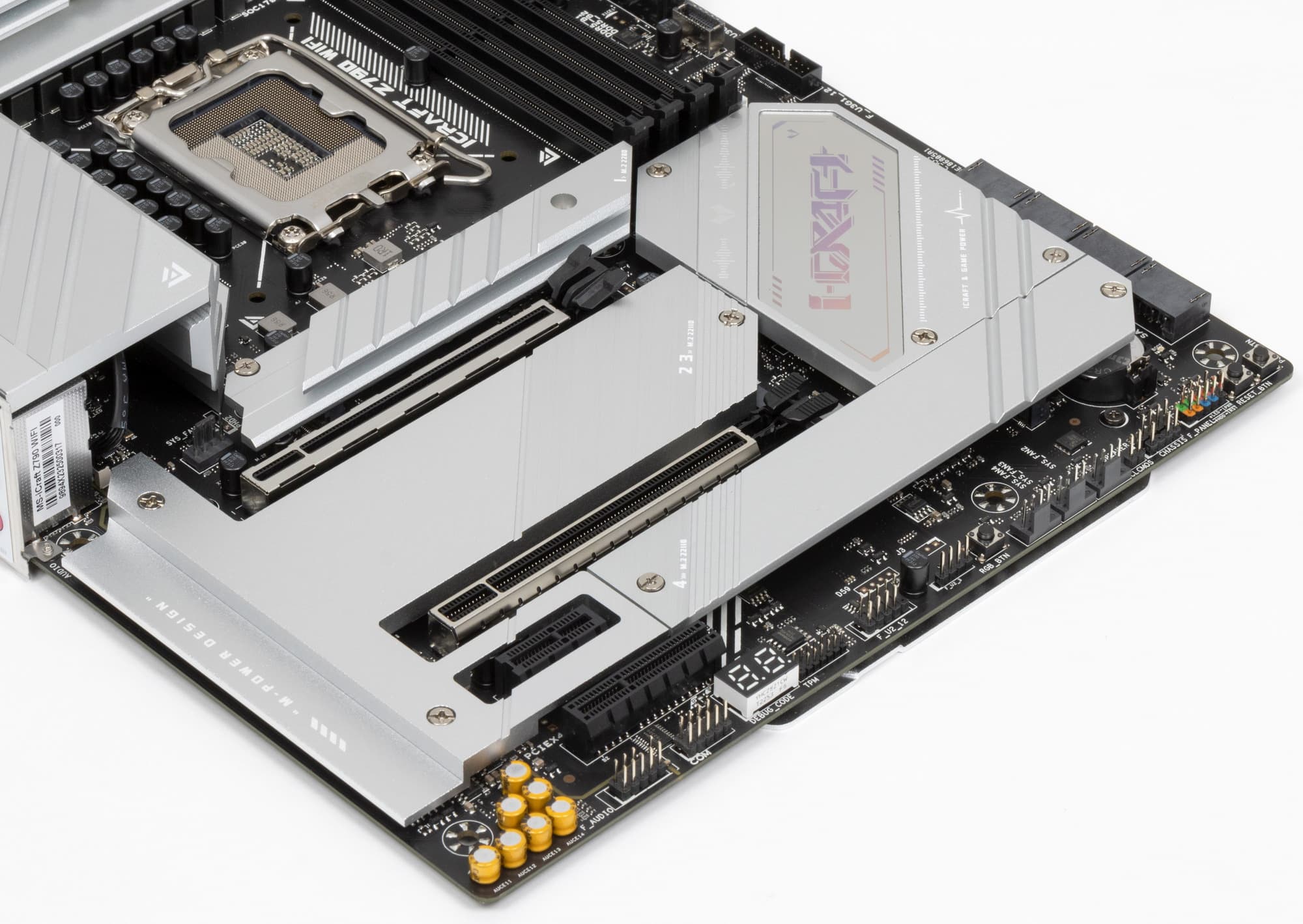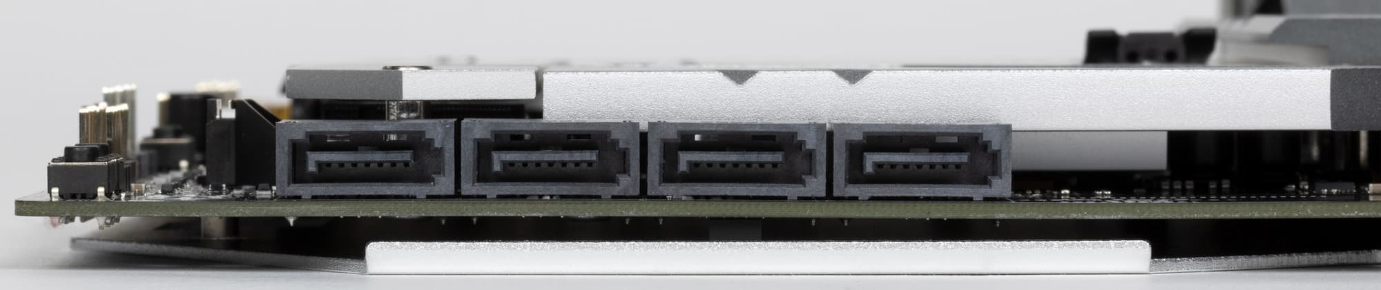 Все M.2 слоты имеют радиаторы. Верхний M.2A и нижний M.2D обладают отдельными радиаторами, когда как слоты M.2B/C имеют общий радиатор.