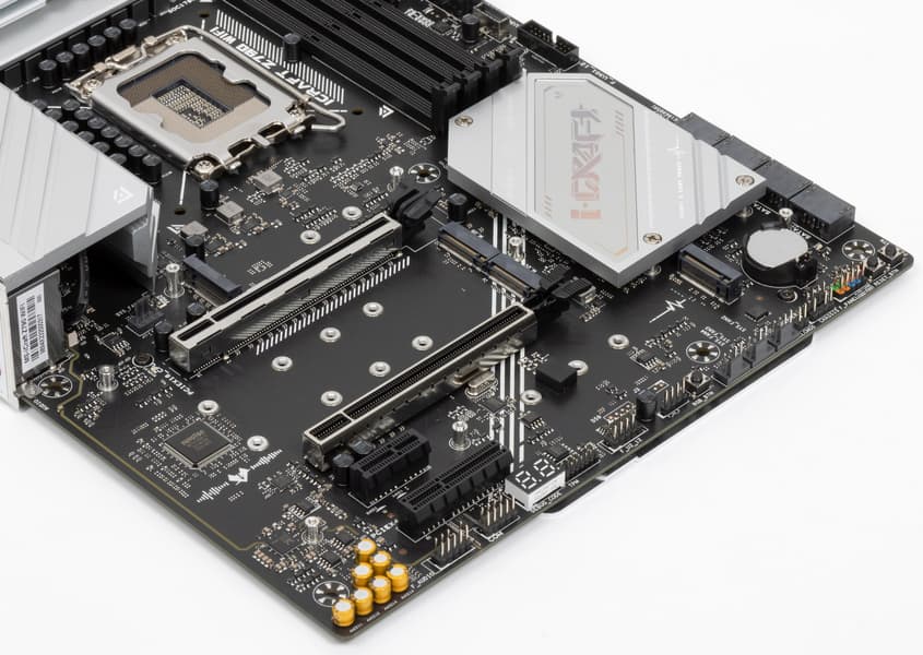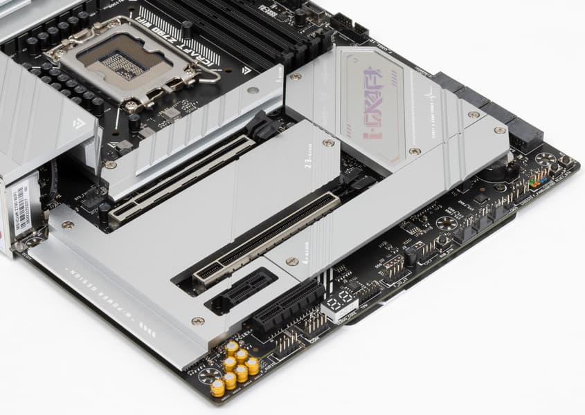Выше я вел речь про первый PCIe x16_1, подключенный к процессору. Остальные слоты подключены к Z790: «длинный» PCIe x16_2 (несмотря на форм-фактор, он работает в режиме x4), PCIe x4 и PCIe x1.
