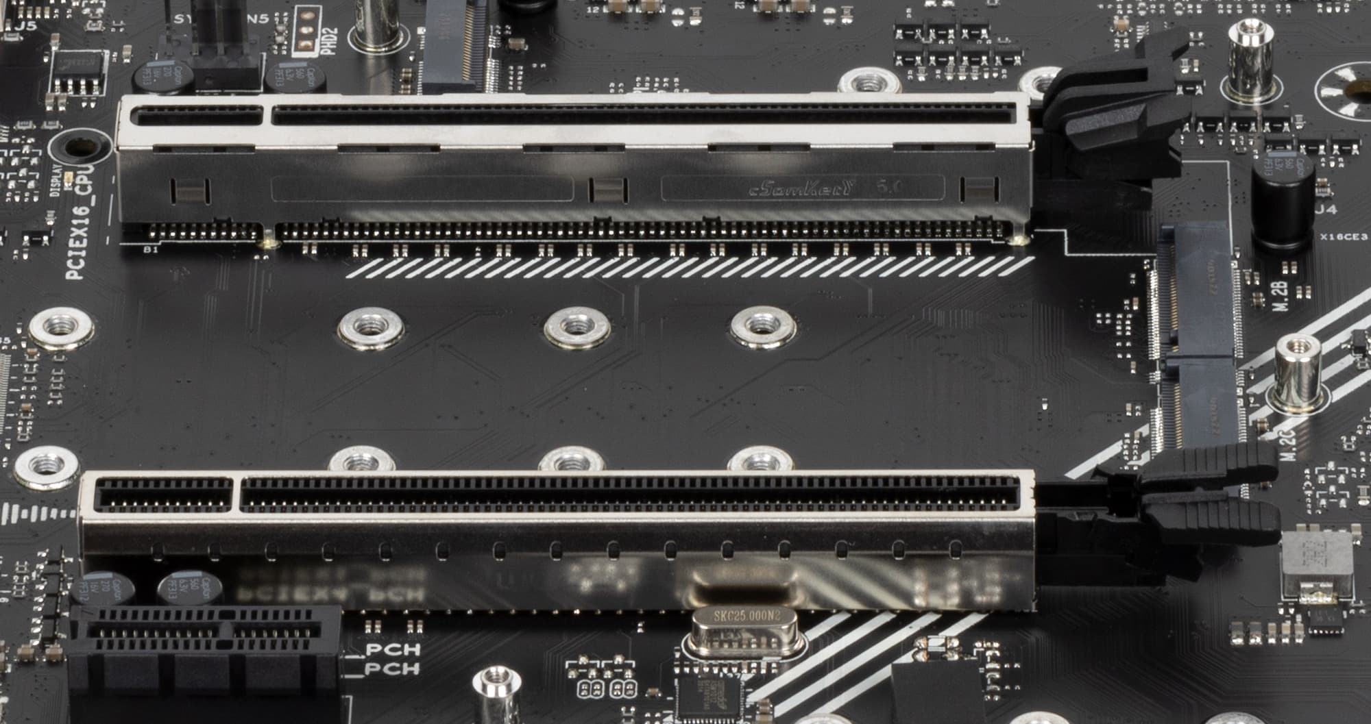 Оба «длинных» слота PCIe x16 имеют металлическое армирование из нержавеющей стали, которое увеличивает надежность. Кроме того, такая защита предохраняет слот от электромагнитных помех.