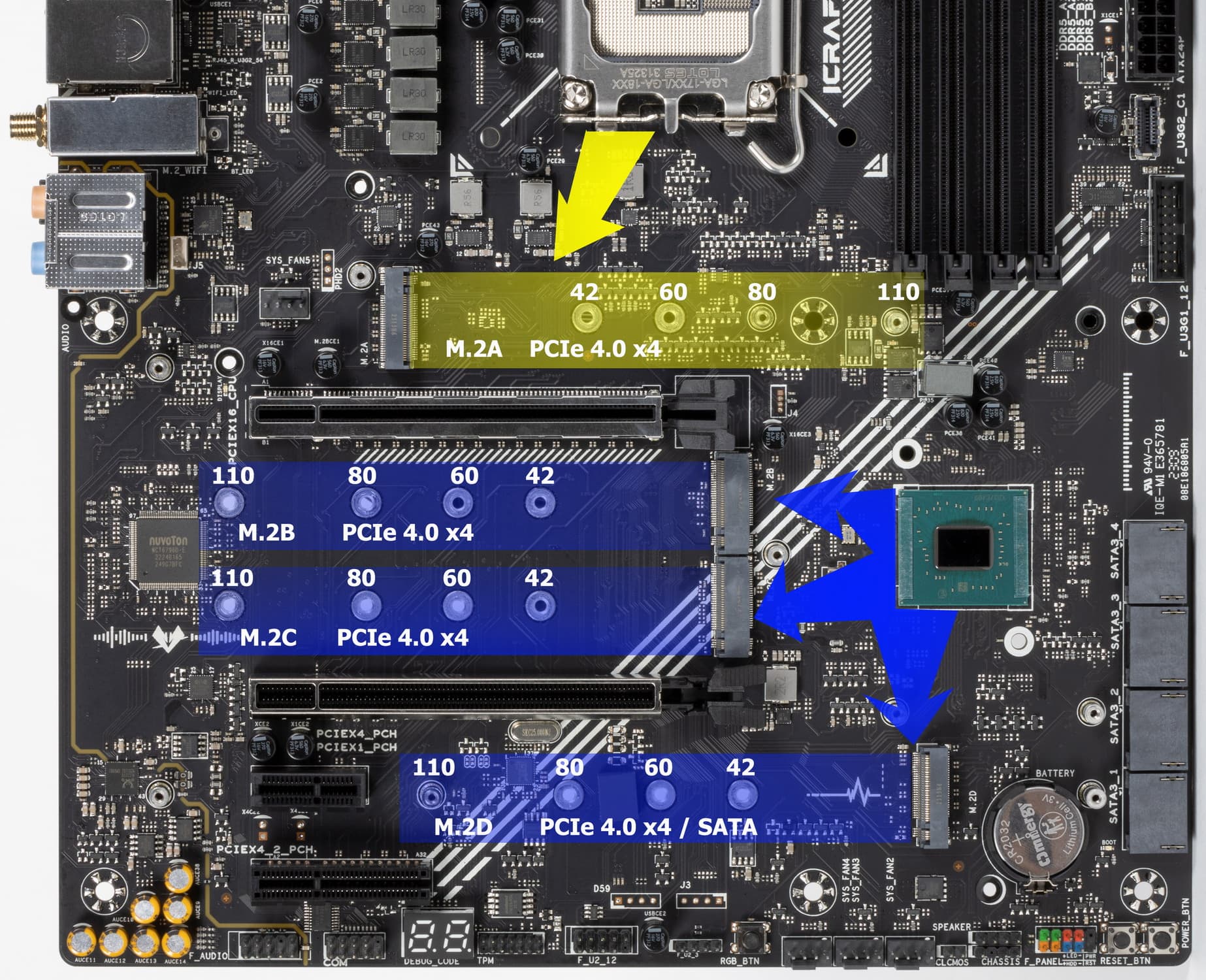Второй, третий и четвертый слоты M.2(B,C,D) получают данные от чипсета Z790.