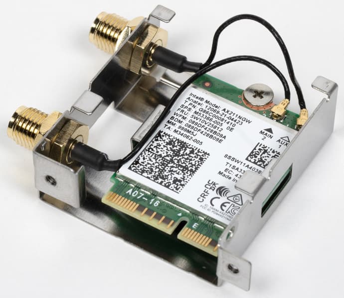 Имеется и комплексный беспроводной адаптер на контроллере Intel AX-211NGW, через который реализованы Wi-Fi 6 (802.11a/b/g/n/ac/ax) и Bluetooth 5.2. Он установлен в слот M.2 (E-key), и его разъемы для привинчивания выносных антенн выведены на заднюю панель.