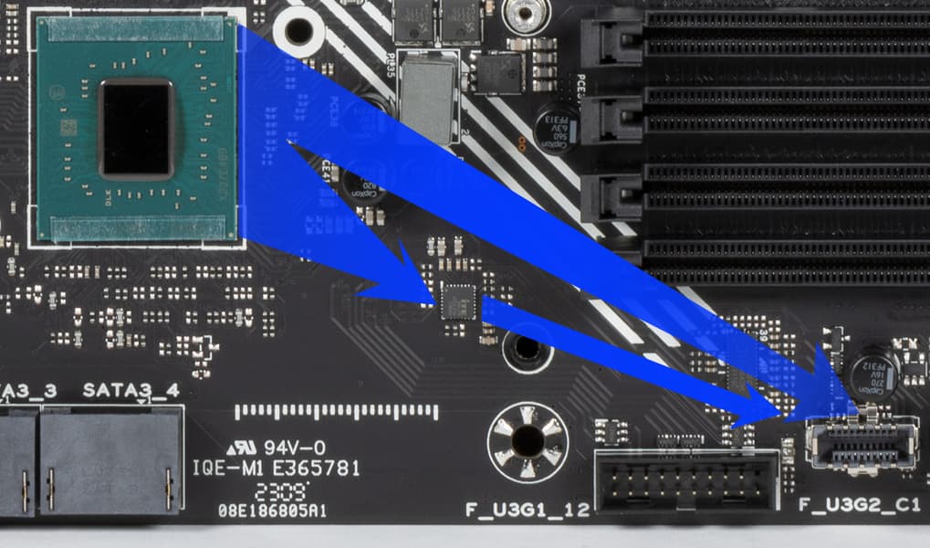 Напомню, что чипсет Z790 обладает в сумме 38 высокоскоростными портами (High Speed In Out, HSIO). Z790 поддерживает до 5х интегрированных USB 3.2 Gen2x2 (до 20 Gb/s) портов (правда каждый из них требует поддержки со стороны двух USB 3.2 Gen2, неважно, от самого Z790 или сторонних хабов).