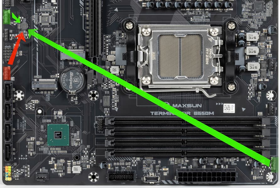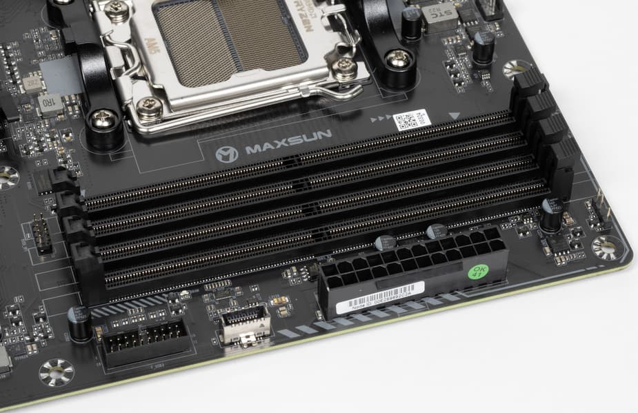 Форм-фактор Micro-ATX имеет размеры 244×244 мм, ATX до 305×244 мм, а E-ATX — до 305×330 мм. Материнская плата Maxsun Terminator B650M WiFi6 имеет размеры 244×244 мм, поэтому выполнена в форм-факторе Micro-ATX, и на ней имеются 8 монтажных отверстий для установки в корпус.