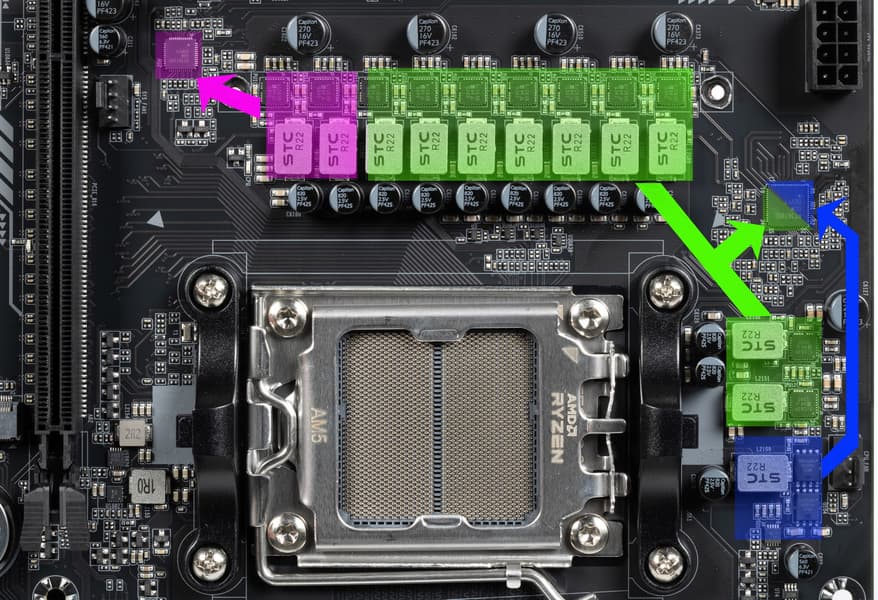 Внешне схема питания выглядит как 9+2+1: 9 фаз — ядро процессора, 2 фазы — SoC (I/O-чиплет Ryzen), 1 фаза — VDD_MISC (вывод встроенной графики).