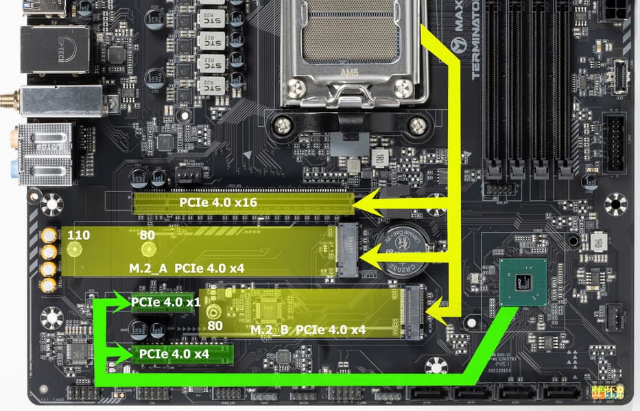 Итак, кроме USB-портов, к которым мы подойдем позже, чипсет B650 обладает 12 PCIe линиями. Считаем, сколько линий уходит на поддержку (связь) с тем или иным элементом: