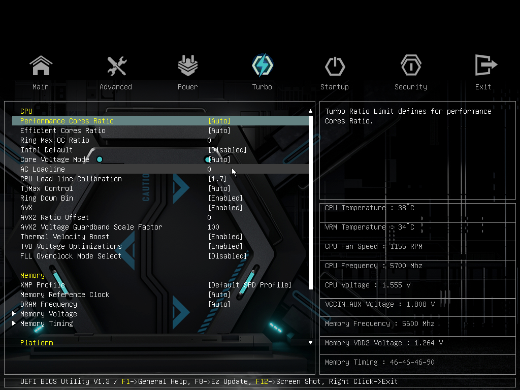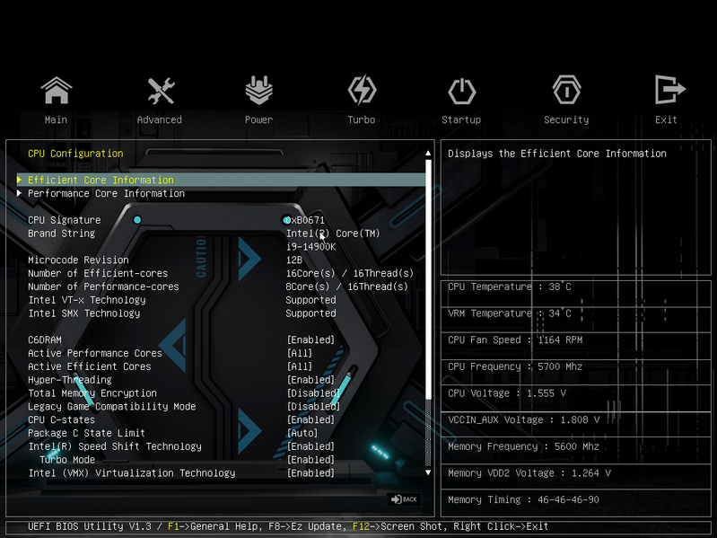 В режиме авторазгона мы получили 5,5 ГГц по P-ядрам, и 3,9 ГГц по всем Е-ядрам. Напомню, что Р-ядра — это обычные всем привычные ядра, имеющие по 2 потока каждый, «Р» — означает Performance, то есть производительные. «Е» — это энергоэффективные ядра, так называемые, малые ядра, у них по 1 потоку.