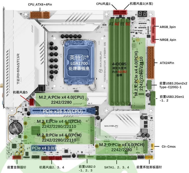У Maxsun Terminator Z790M D5 Ice имеется 15 портов USB разных видов, включая 2 очень быстрых USB 3.2 Gen2×2, 4 USB 3.2 Gen2 и 2 USB 3.2 Gen1. Плата предлагает 1 слот PCIe х16, который получает от процессора 16 линий PCIe версии 5.0, плюс слот PCIe x4, который подключен к чипсету. Также у платы аж 5 (пять!) слотов M.2: первый подключен напрямую к процессору, 4 других — к чипсету, все — линиями PCIe 4.0. Плата имеет 6 разъемов для вентиляторов и 4 порта SATA.
