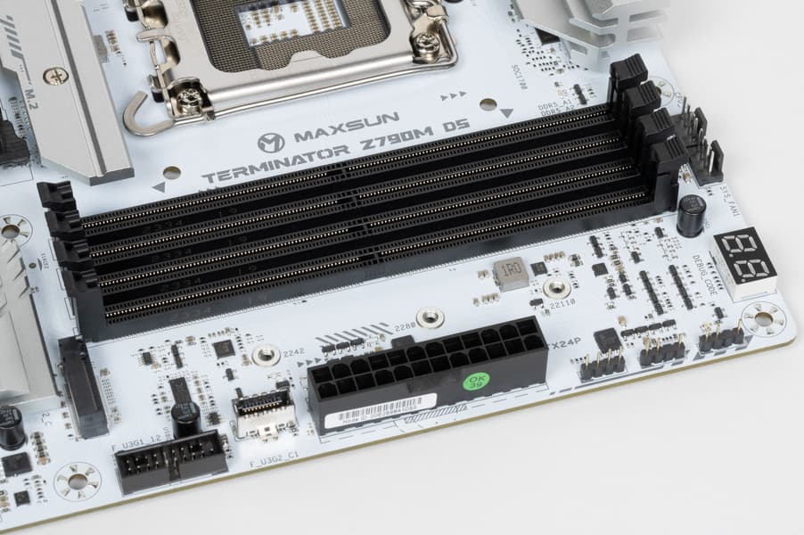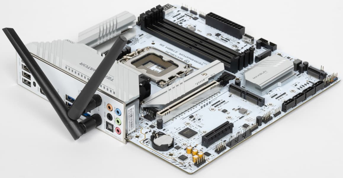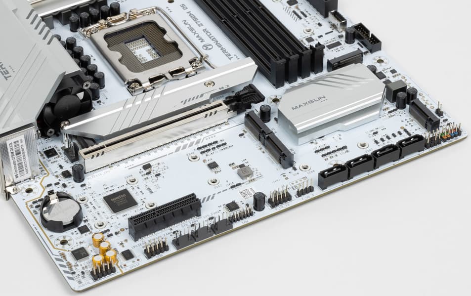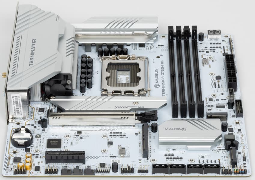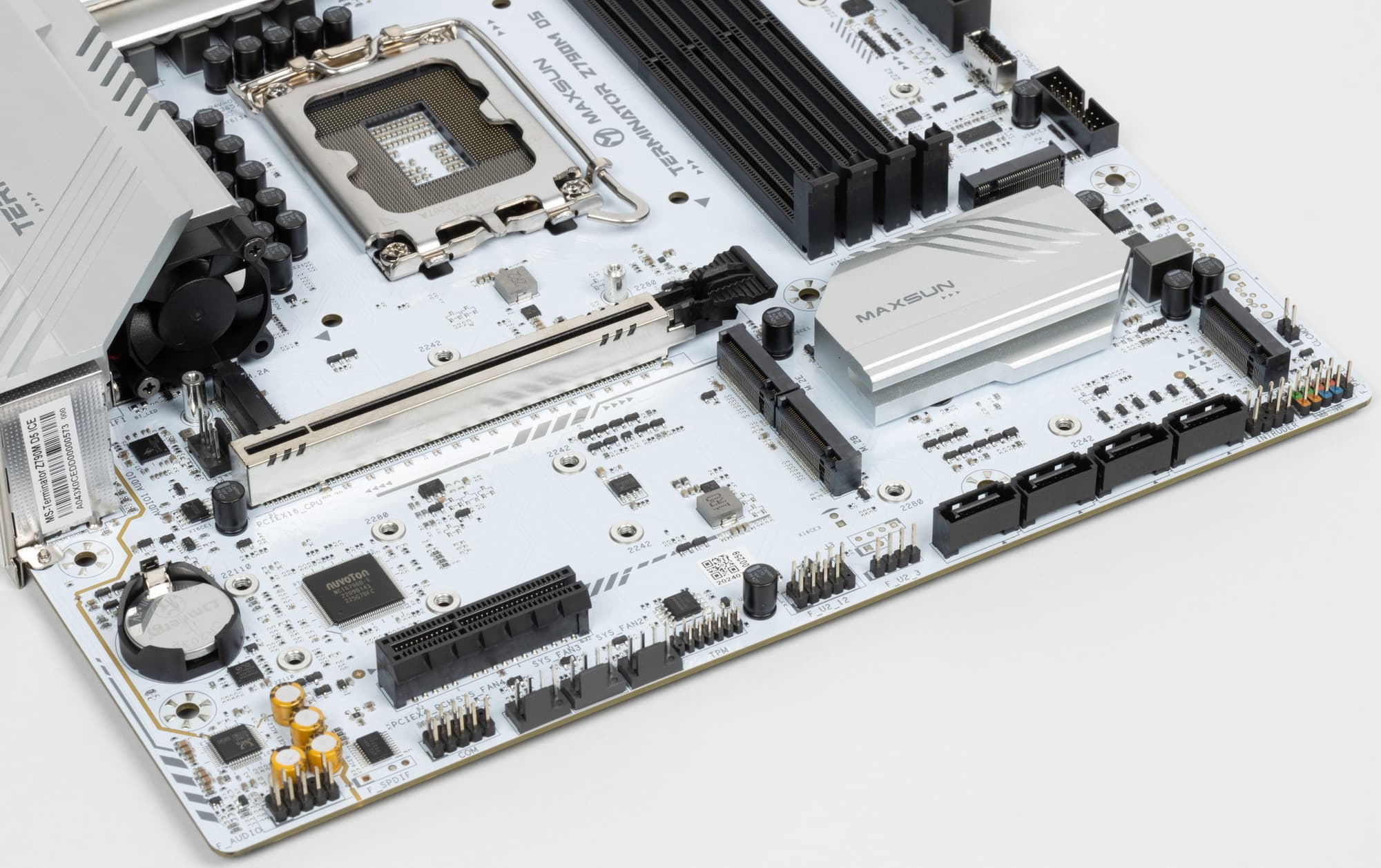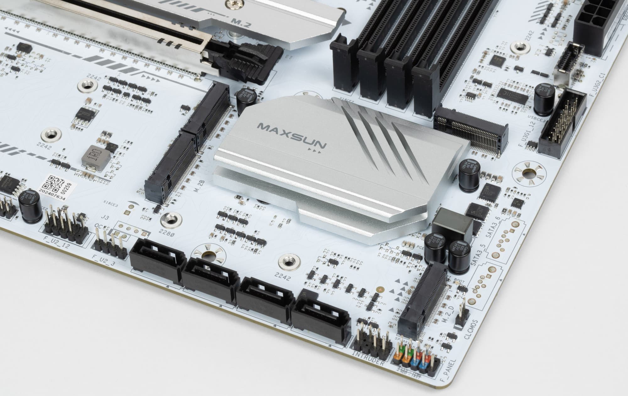 Maxsun Terminator Z790M D5 Ice — красивая среднебюджетная материнская плата в белых тонах на чипсете Intel Z790. По поддержке периферии она практически не уступает аналогам именитых и хорошо известных производителей (а по количеству слотов M.2 превосходит многих), но при этом стоимость платы раза в 2 ниже, чем у флагманских моделей на том же чипсете (примерно 20-25 тысяч рублей на момент подготовки обзора).