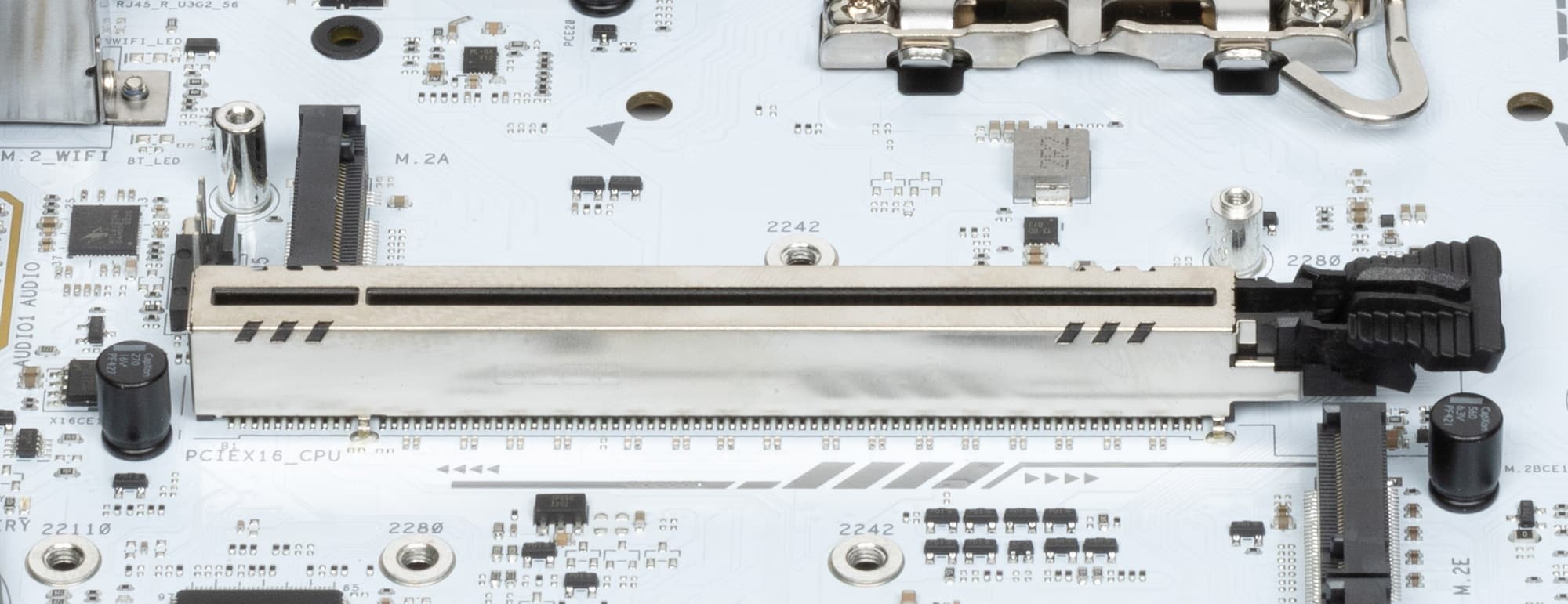 «Длинный» слот PCIe x16 имеет металлическое армирование из нержавеющей стали, которое увеличивает надежность. Кроме того, такая защита предохраняет слот от электромагнитных помех.