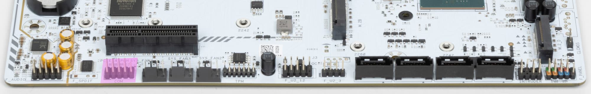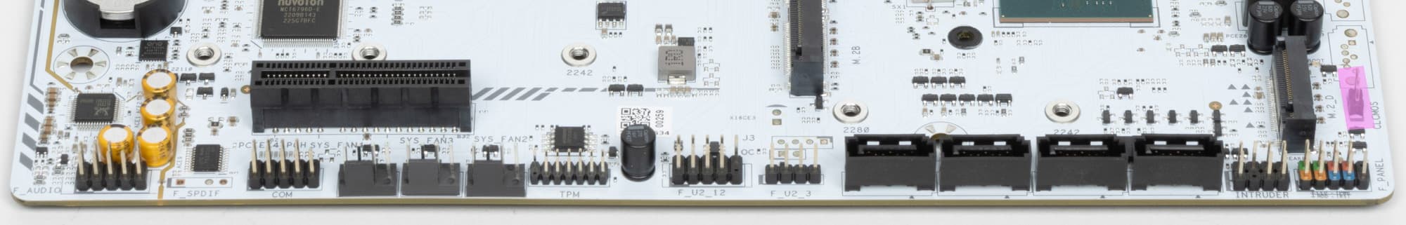 26 линий PCIe оказались занятыми (18 PCIe 4.0 + 4 SATA + 4 PCIe 3.0). Связь с аудиокодеками уровня Realtek RTL408x идет через USB 2.0, а с кодеками уровня RTL1220 и ниже – через HDA (эмуляцию шины PCI), так что в данном случае линия USB 2.0 не расходуется. Но один USB 2.0 расходуется на поддержку слота M.2 (Key E) для беспроводной связи, а также контроллер FE1.1S для своих нужд использует сигнальные линии USB 2.0. Детально об этом ниже в разделе USB-портов.