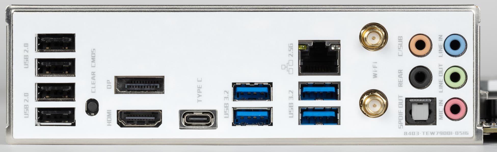 | Разъемы на задней панели | 1 × USB 3.2 Gen2x2 (Type-C) 4 × USB 3.2 Gen2 (Type-A) 4 × USB 2.0 (Type-A) 1 × RJ-45 2 × разъема для крепления антенны беспроводной связи 5 аудиоразъемов типа миниджек 1 × оптический S/PDIF 1 × кнопка сброса CMOS 1 × DP-out 1 × HDMI-out |
