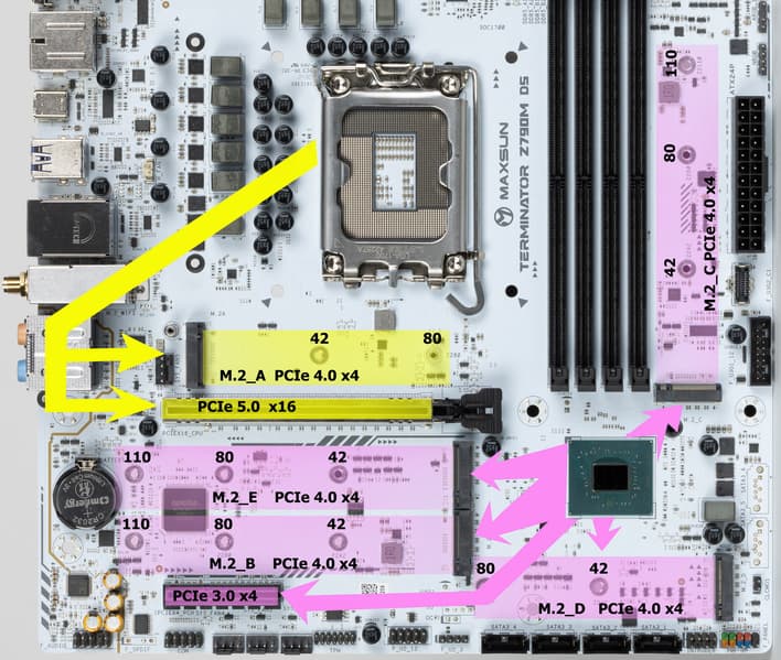 Второй, третий, четвертый и пятый слоты M.2_B/C/D/E получают данные от чипсета Z790.