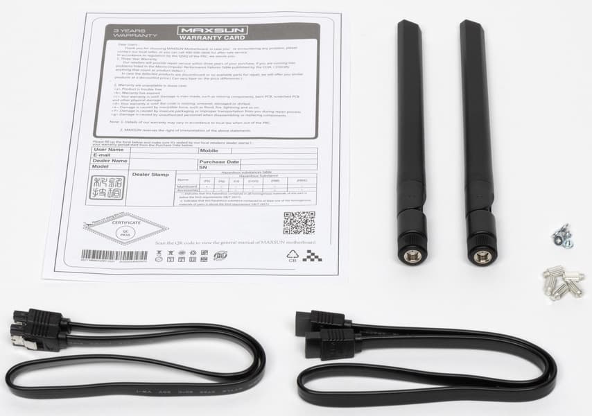 Maxsun Terminator Z790M D5 Ice поставляется в обычной картонной упаковке в бело-черных тонах, подчеркивающих расцветку самой платы. Комплект размещен под платой в отдельном отсеке.