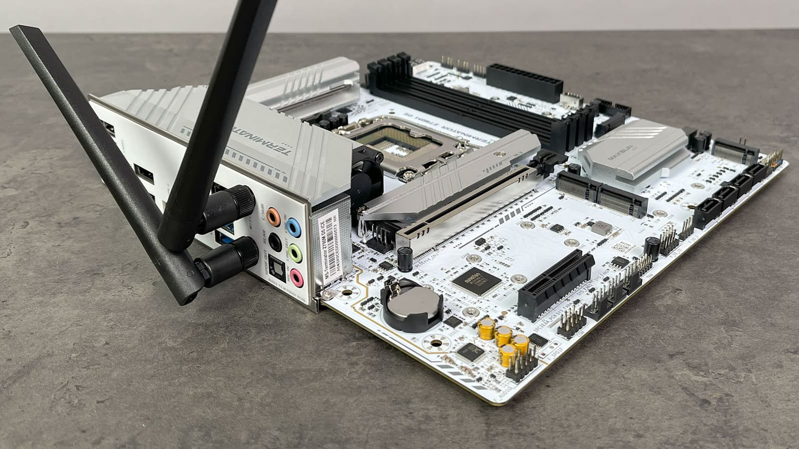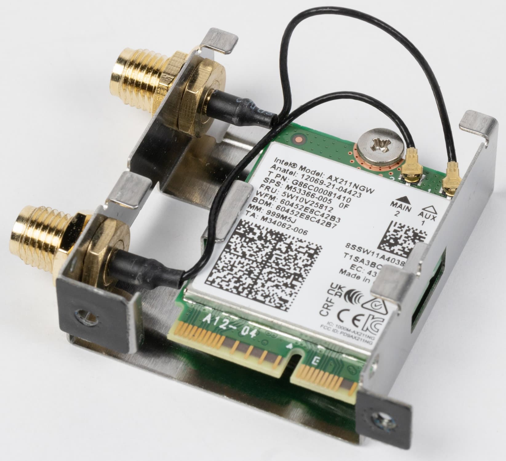 Имеется и комплексный беспроводной адаптер на контроллере Intel AX-211NGW, через который реализованы Wi-Fi 6 (802.11a/b/g/n/ac/ax) и Bluetooth 5.2. Он установлен в слот M.2 (E-key), и его разъемы для привинчивания выносных антенн выведены на заднюю панель.