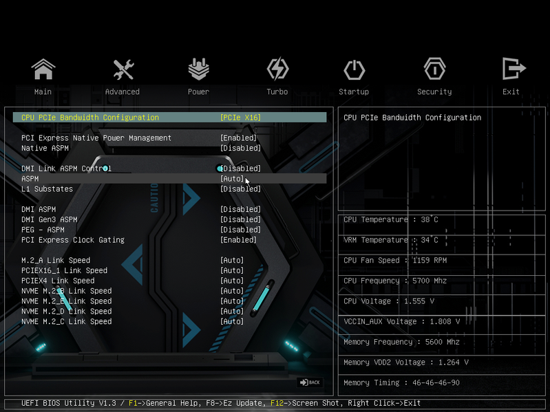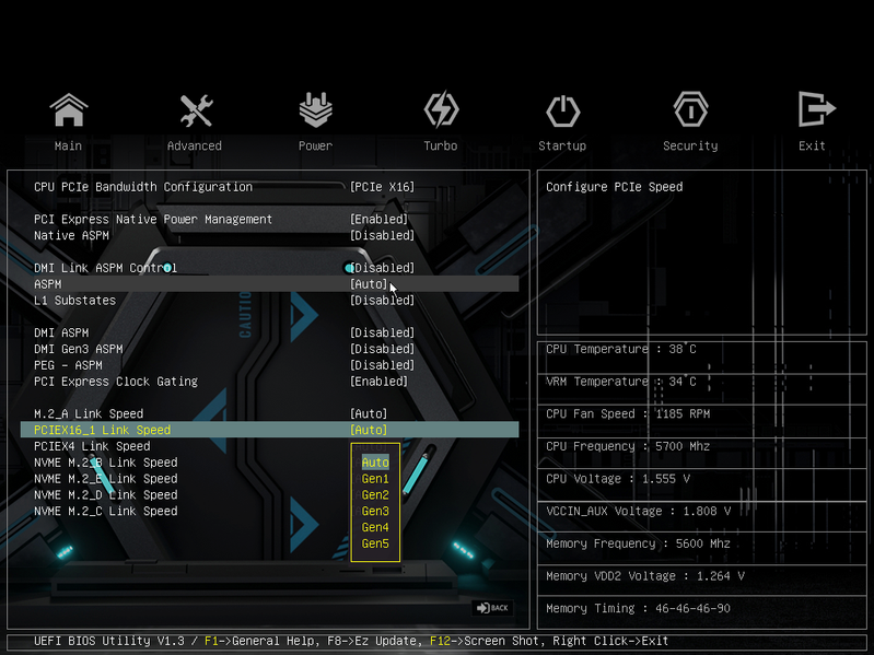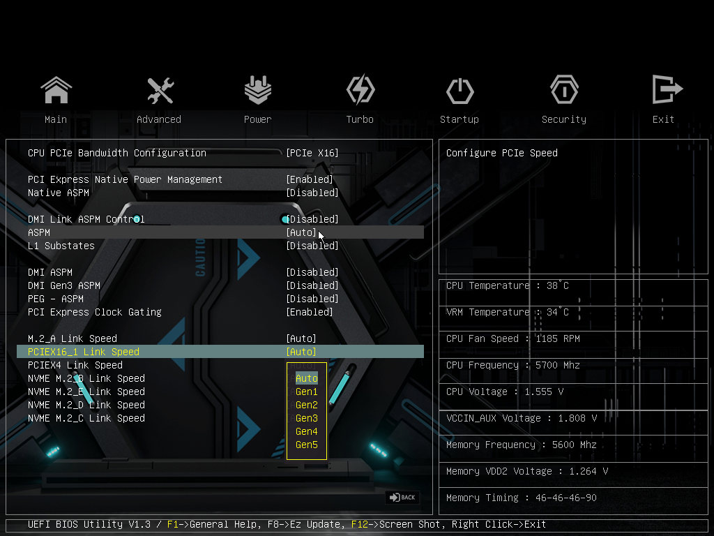 Теперь посмотрим выше на то, как работают процессоры в данной конфигурации. У CPU 12/13/14-го поколений всего 20 линий PCIe, 4 из них версии PCIe 4.0 отведены на порт М.2 (M.2_A). Оставшиеся 16 линий PCIe 5.0 идут на слот PCIe x16_1, так что вариантов переключений нет.