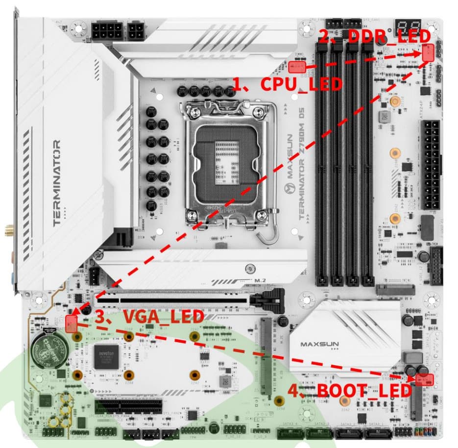 Форм-фактор Micro-ATX имеет размеры 244×244 мм, ATX до 305×244 мм, а E-ATX — до 305×330 мм. Материнская плата Maxsun Terminator Z790M D5 Ice имеет размеры 244×244 мм, поэтому выполнена в форм-факторе Micro-ATX, и на ней имеются 8 монтажных отверстий для установки в корпус. Одно отверстие закрыто радиатором для слота М.2