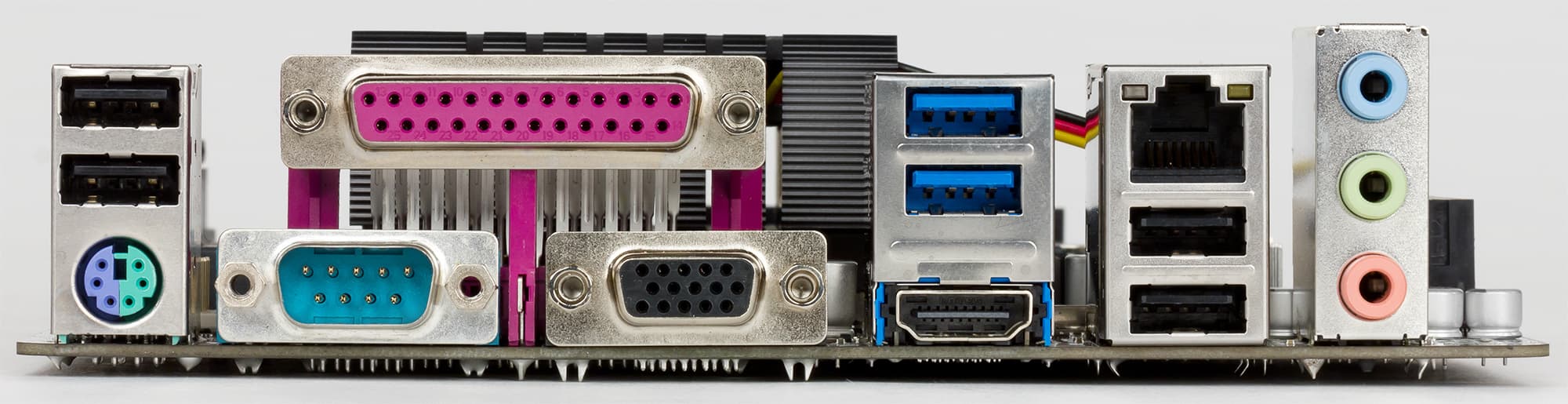 Что забавно, изначально о разрабатываемой тогда же шине USB «забыли» — порты этого типа в оригинальном стандарте АТХ отсутствовали. Однако заложенная в него гибкость себя оправдала сразу же — место для них нашли. Точно также в 90-е годы еще не было и речи о портах типа HDMI или DisplayPort, да и вообще интегрированная графика делала первые шаги, зато стандартом было выводить наружу LPT- и COM-порты, которые сейчас уже сложно найти. На первых платах практически всегда присутствовали два порта PS/2 для клавиатуры и мыши — сейчас нередко не бывает ни одного, но проблем это не вызывает. По сути, от производителя корпуса требуется лишь предусмотреть в своем продукте «стандартное» прямоугольное отверстие и все — в таковой можно будет установить любую плату и свободно менять ее при необходимости вместе с заглушкой, как правило, к платам прилагаемой (можно и без нее, но будет не очень красиво, да и пыль попадать в корпус начнет в повышенных количествах). Поэтому купленный один раз хороший корпус может служить верой и правдой лет 10-15, как максимум потребовав смены блока питания. Все проблемы, которые возникают при модернизации связаны либо с ним, либо с габаритами некоторых плат расширения (типа топовых видеокарт), но не с системной платой: таковая всегда подойдет к корпусу того же или большего форм-фактора.
