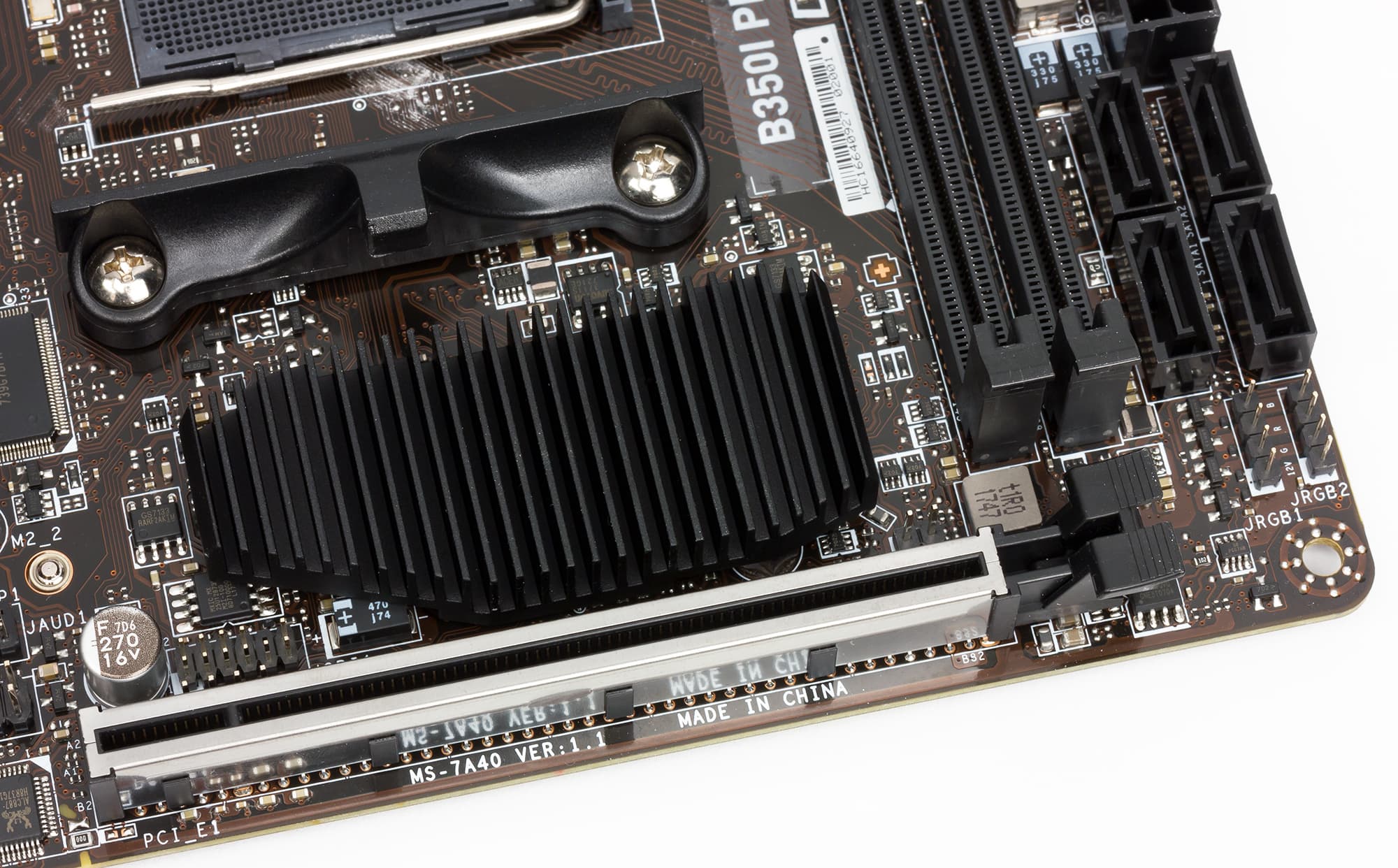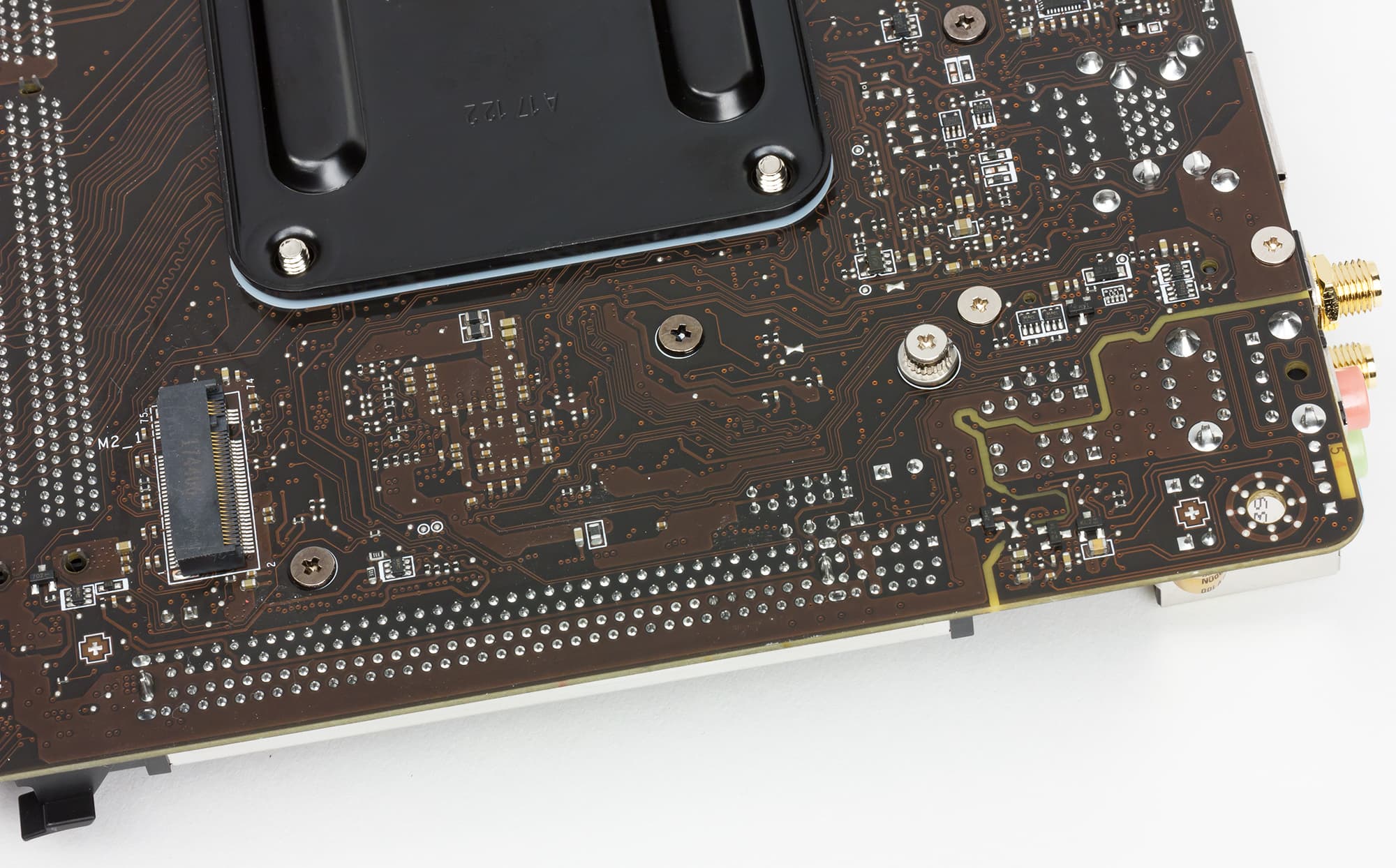 Формат Mini-ITX предусматривает всего один слот расширения обычного формата — вот один PCIe 3.0 x16 здесь и установлен. При установке любых APU или Athlon он превратится в х8, но работать будет. Кроме него на обратной стороне платы присутствует разъем M.2 M-Key, предназначенный для установки твердотельных накопителей типоразмера 2280. Более короткие или длинные варианты не поддерживаются, что, впрочем, проблемы не составляет: 90% продающихся в розницу SSD с разъемом M.2 — это как раз 2280. Подключен этот разъем непосредственно к процессору и поддерживает устройства PCIe 3.0 x4 (только в паре с Ryzen — иначе х2) и SATA.