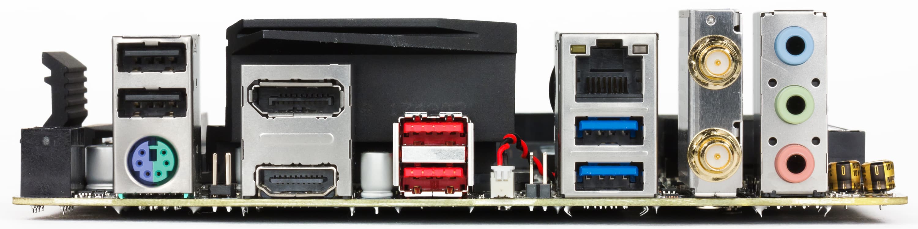 | Разъемы на задней панели | 2 × USB 3.1 Type-A 2 × USB 3.0 Type-A 2 × USB 2.0 1 × RJ-45 1 × PS/2 1 × M.2 WiFi 1 × HDMI 1 × DisplayPort 1.2 3 аудиоразъема типа миниджек |