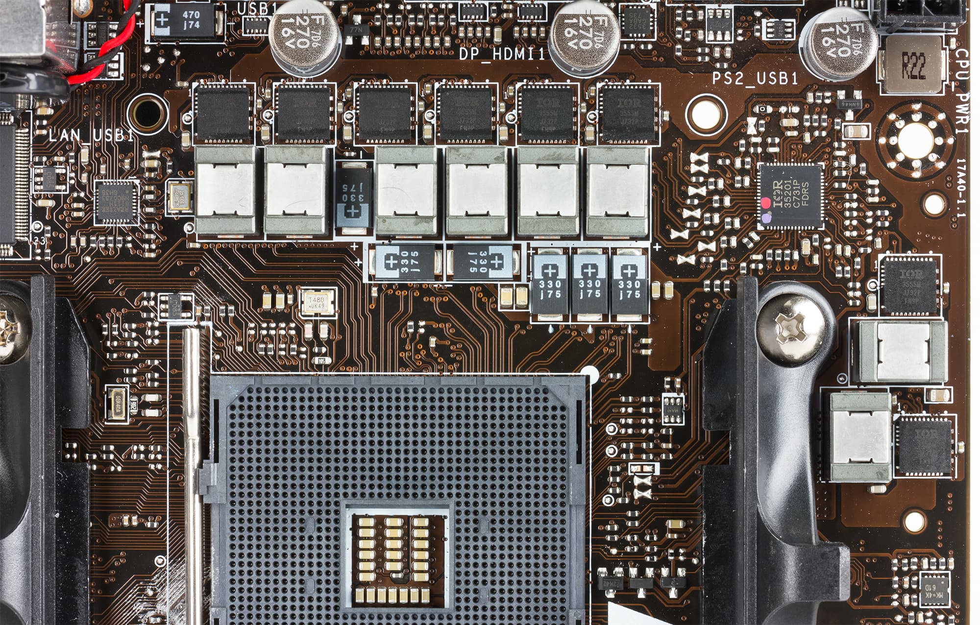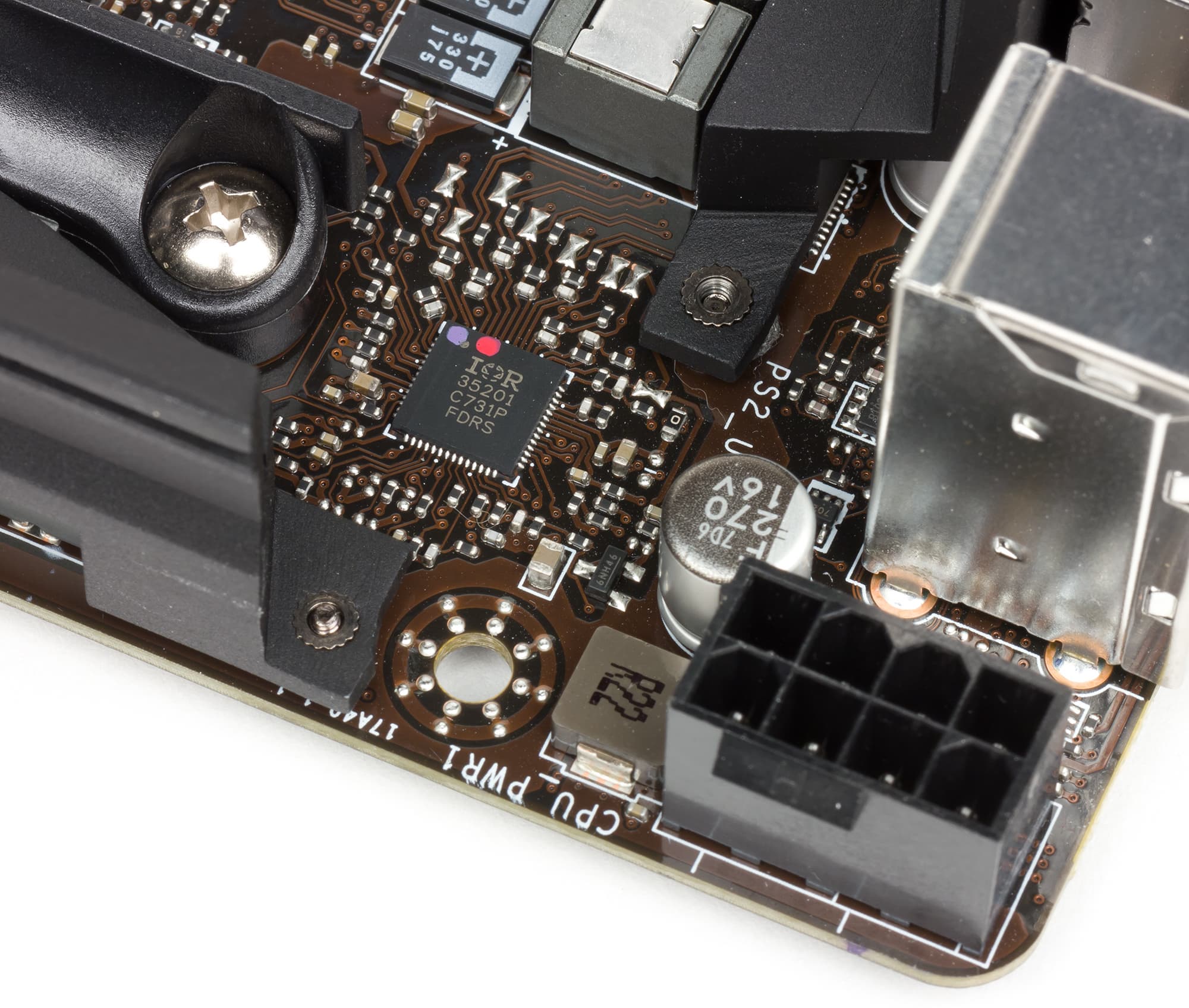 Как и большинство плат, эта имеет 24-контактный и 8-контактный разъемы для подключения блока питания. В момент анонса платы почему-то говорилось о девятифазной системе питания, хотя на практике конвертер напряжений построен на базе 8-канального PWM-контроллера IR 35201 производства International Rectifier. Каждый же канал обслуживается одной катушкой индуктивности и полевым транзистором IR 3553. В целом все просто, но для практического применения достаточно.