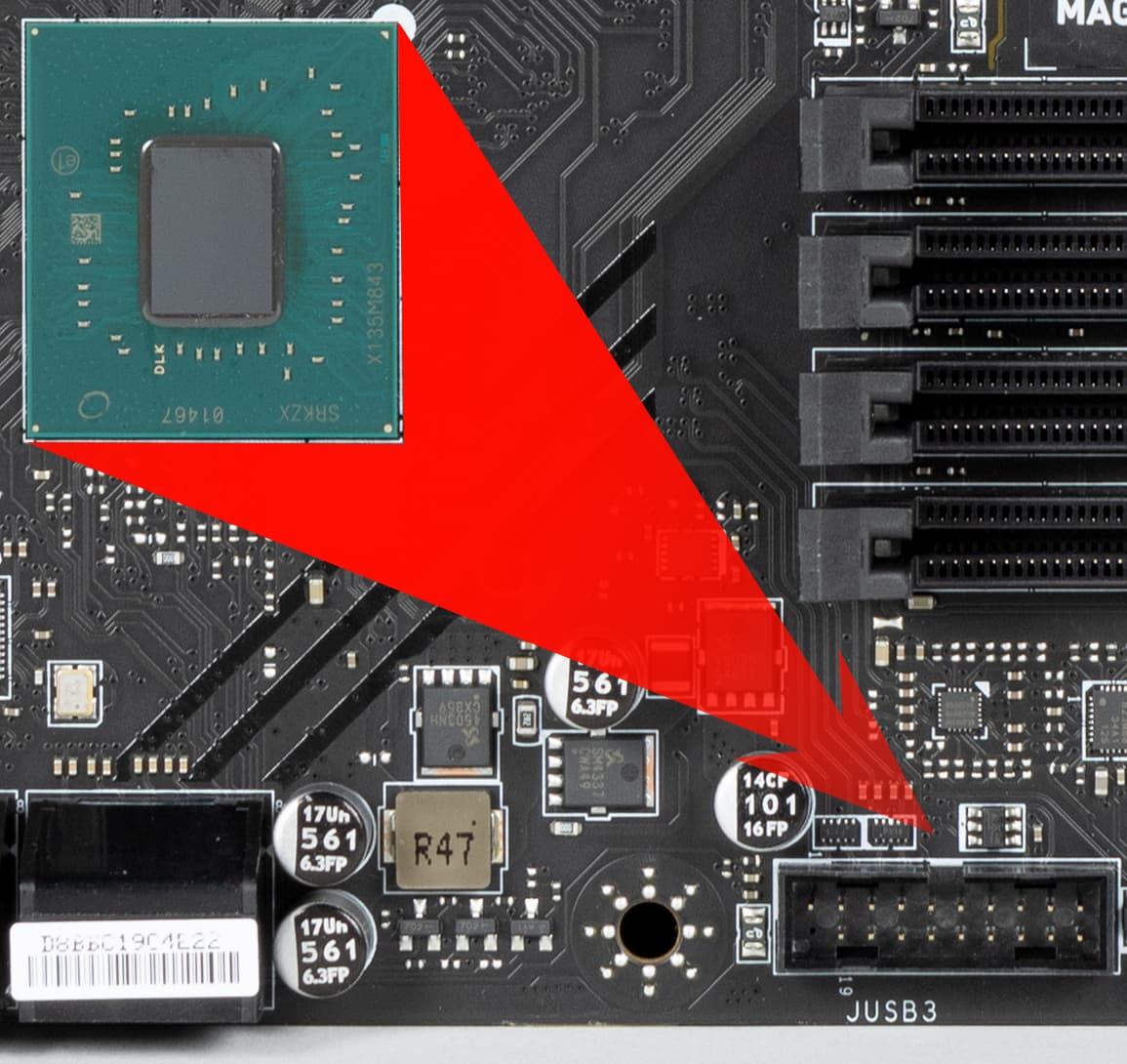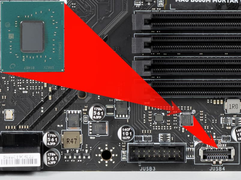 - 4 порта USB 3.2 Gen2: 1 реализован через B760 и представлен внутренним портом Type-C (для подключения к соответствующему разъему на передней панели корпуса); остальные 3 реализованы через хаб Genesys Logic GL3590 (на него потрачена 1 линия PCIe 4.0 от B760) и представлены на задней панели 3 портами Type-A (красного цвета);