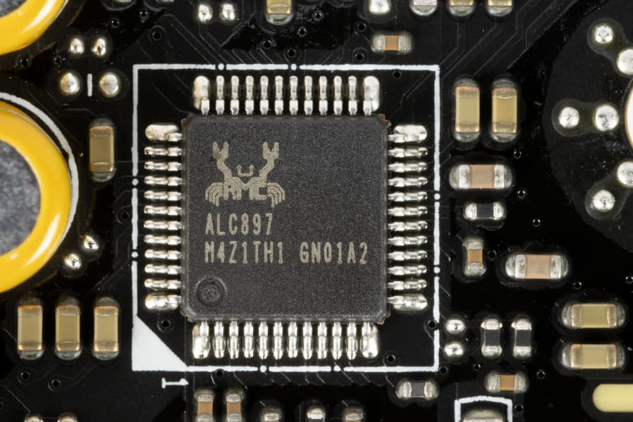 Много лет в большинстве современных материнских платах звуком заведуют аудиокодеки от Realtek семейства ALC, и долгое время это был ALC1220. Он обеспечивает вывод звука по схемам до 7.1 с разрешением до 24 бит / 192 кГц. В данном случае используется более старый и простой вариант ALC897.