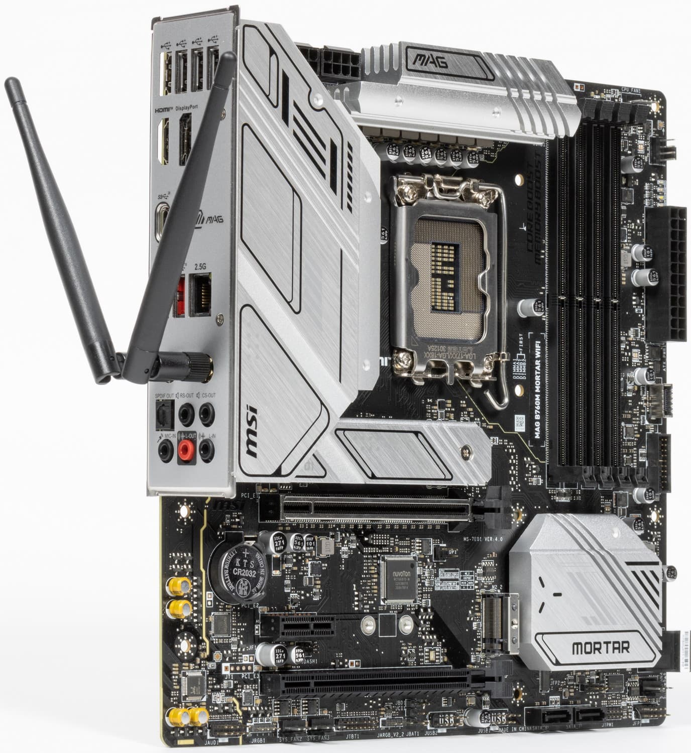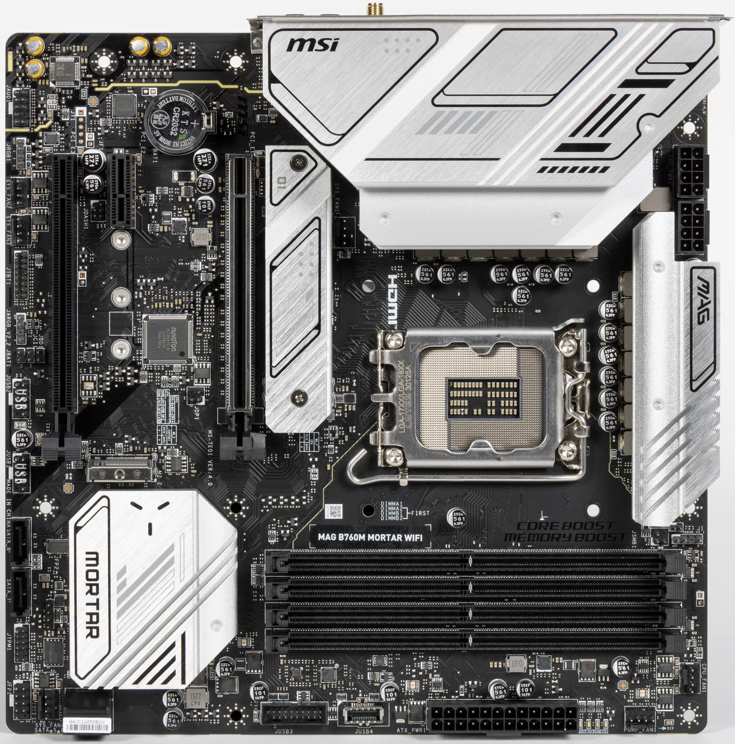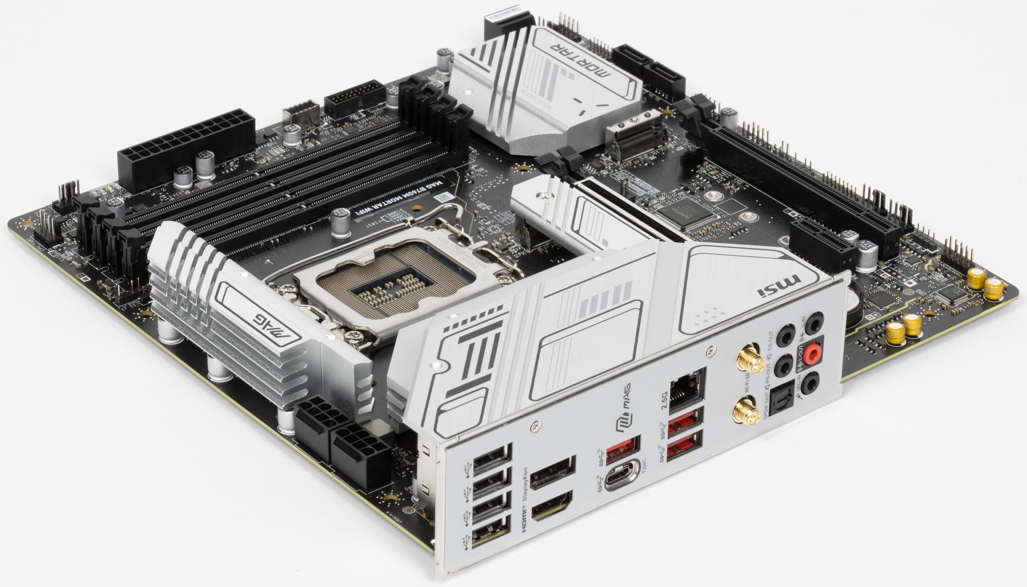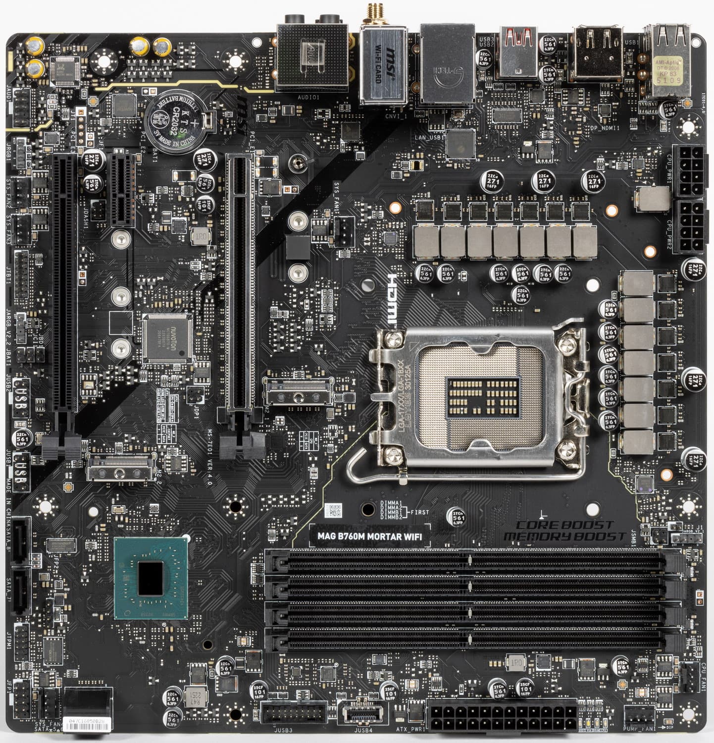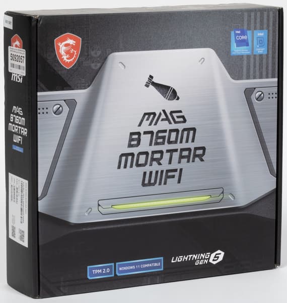 MSI MAG B760M Mortar WiFi поставляется в стандартной коробке фирменного серого дизайна серии MAG. Комплект размещен под платой в отдельном отсеке.