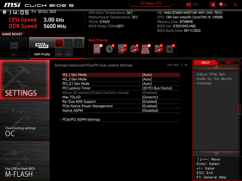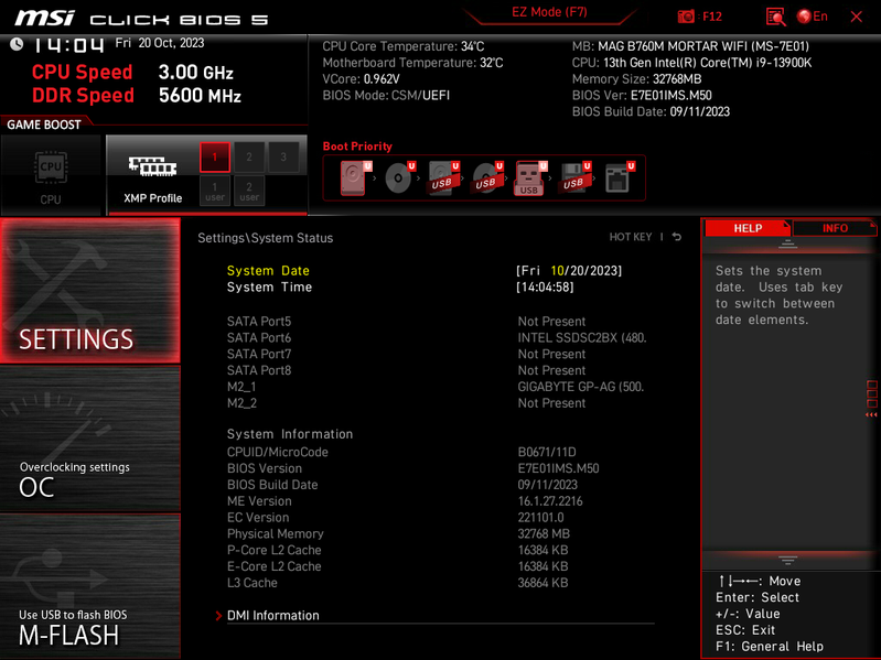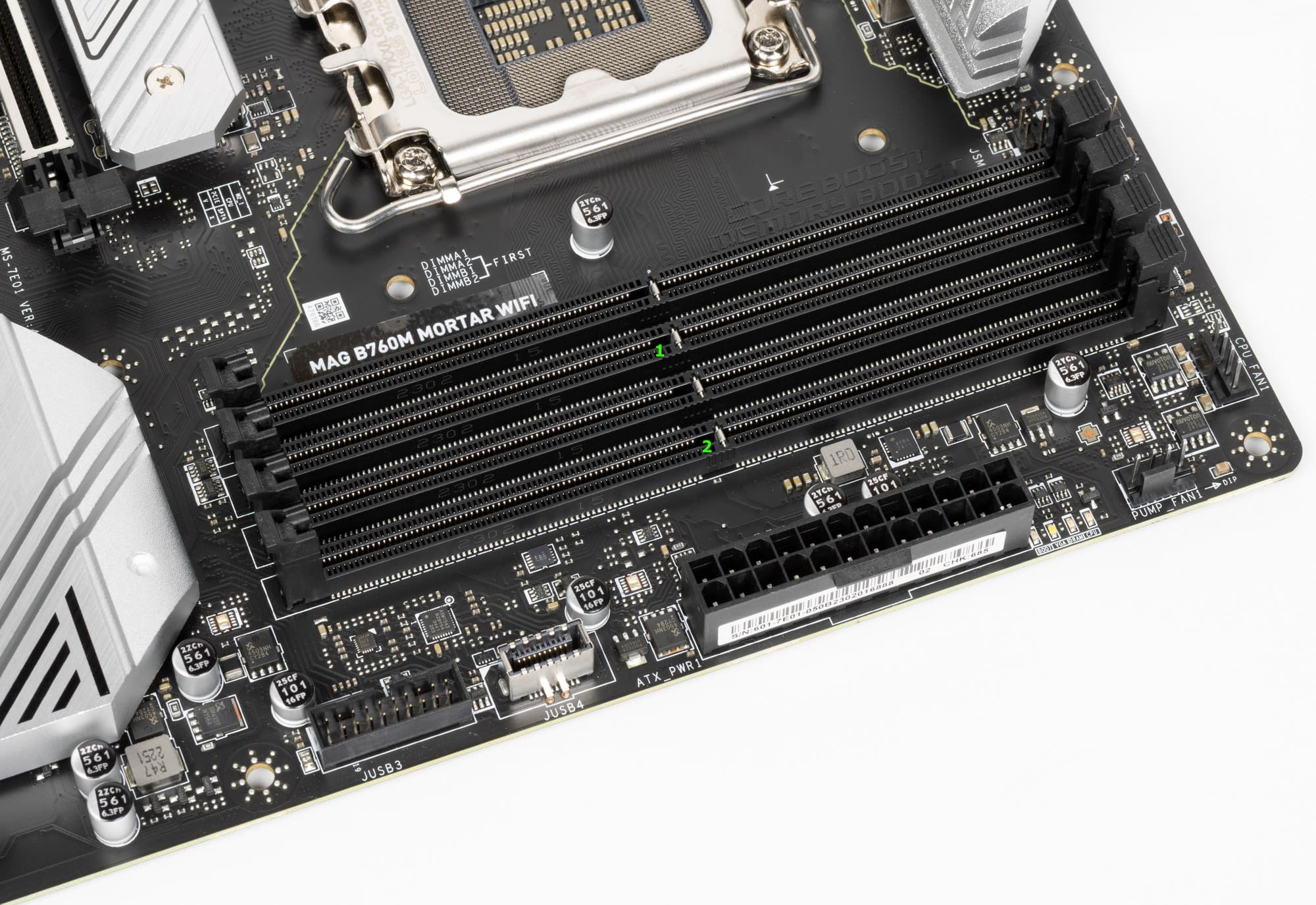 Для установки модулей памяти на плате MSI имеется четыре DIMM-слота (для работы памяти в Dual Channel в случае использования всего 2 модулей их следует устанавливать в А2 и B2. Плата поддерживает небуферизованную память DDR5 (non-EСС), а максимальный объем памяти составляет 192 ГБ. Разумеется, поддерживаются профили XMP.