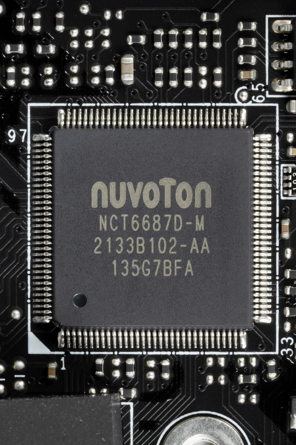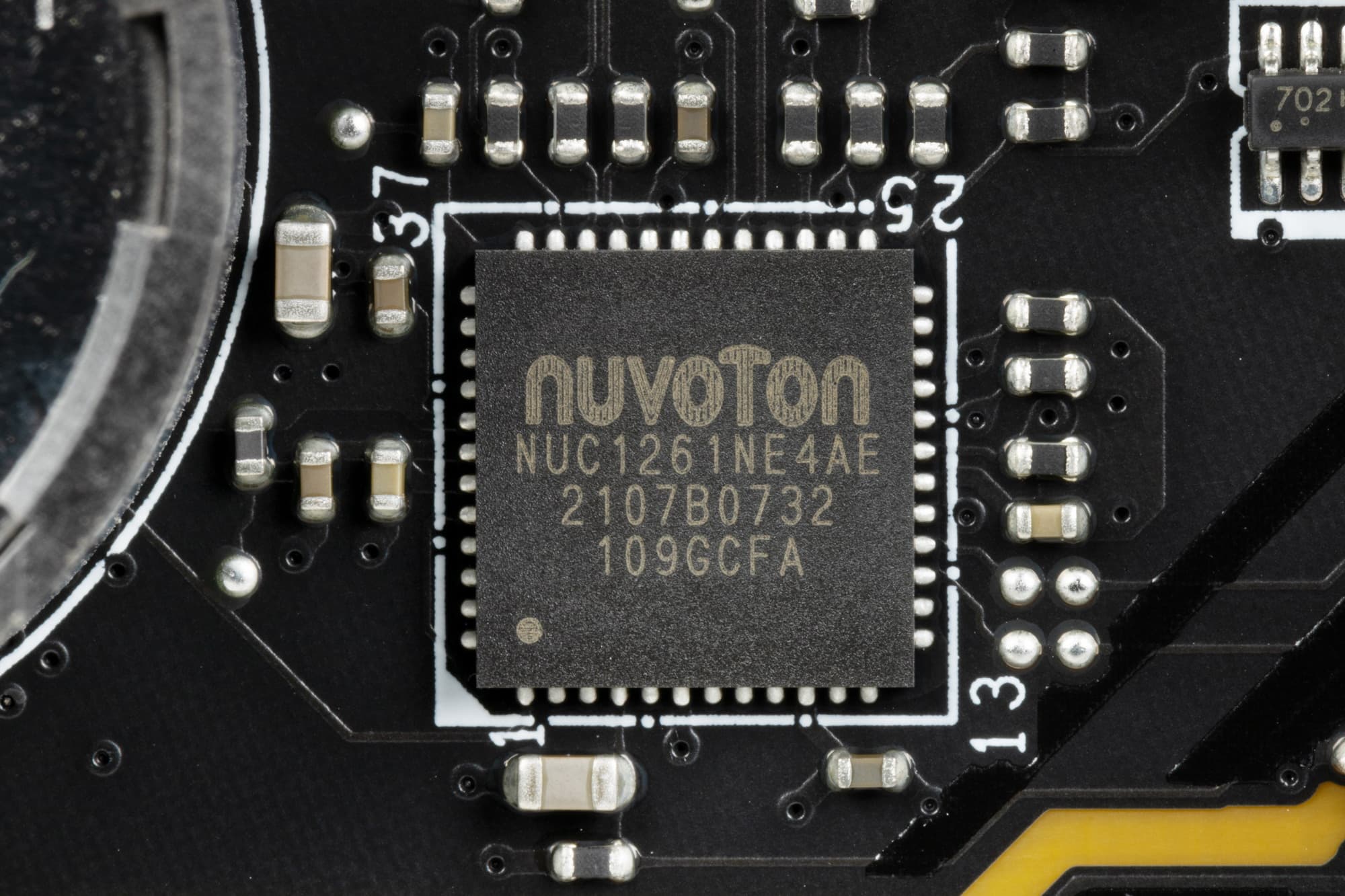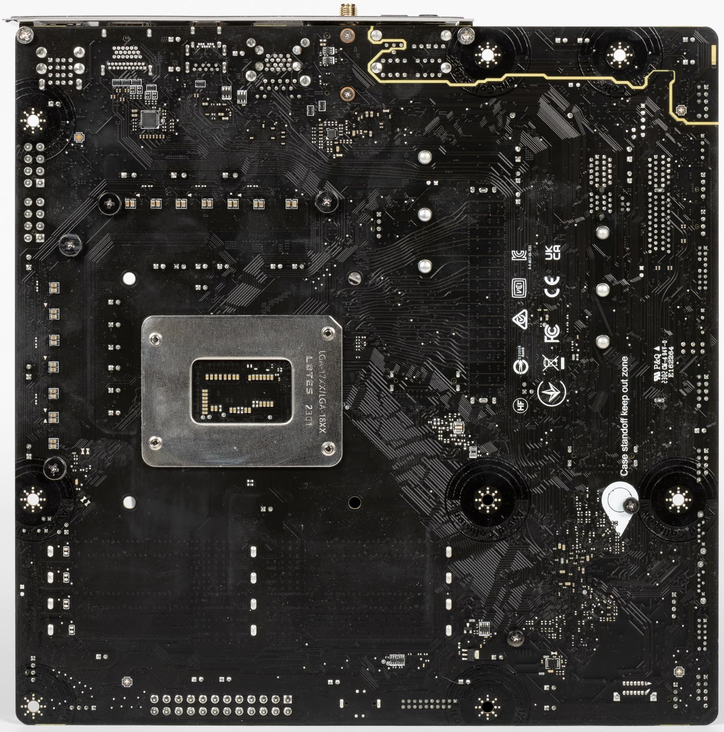По традиции у всех плат от MSI на оборотной стороне обозначены места, где могут оставаться ненужные в данный момент крепежные втулки (чаще всего латунные), на которые обычно ложится матплата в корпусе, и к которым ее прикручивают. Эти места отмечены белой краской (в данном случае это одно такое место), и нарочно в них нет никаких электропроводных элементов, чтобы в случае установки матплаты не было случайных замыканий или повреждений от лишней крепежной втулки.