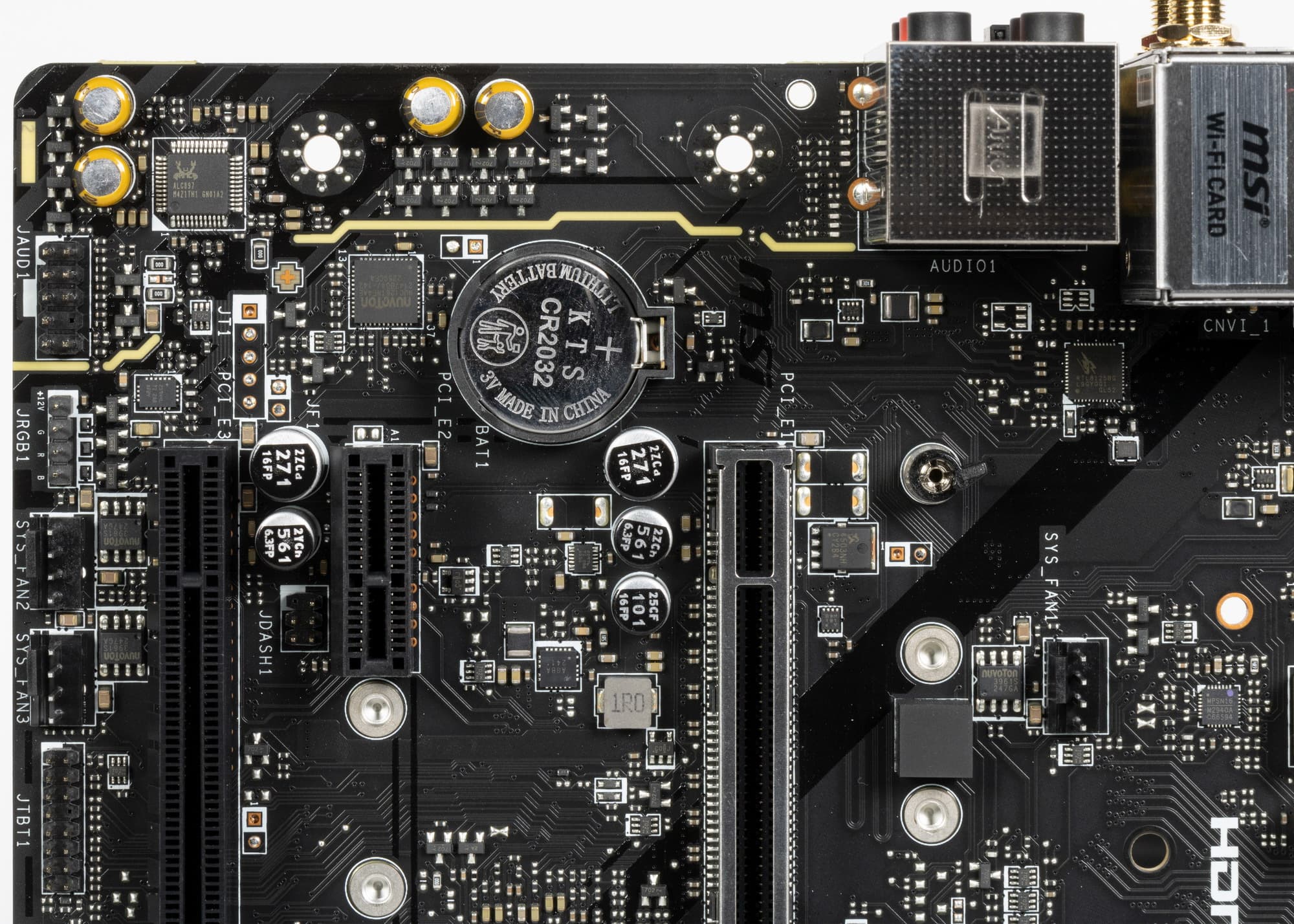 Аудиотракт вынесен на угловую часть платы, не пересекается с другими элементами. Все аудиоразъемы на задней панели не имеют привычной цветовой окраски разъемов, поэтому ориентироваться можно только по обозначениям.