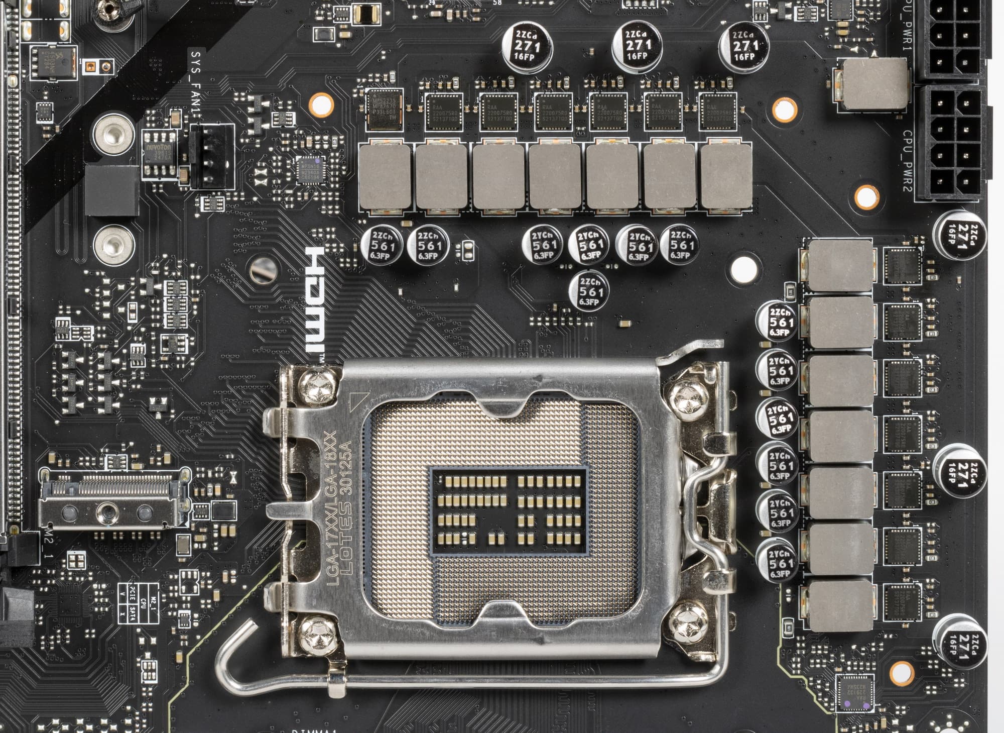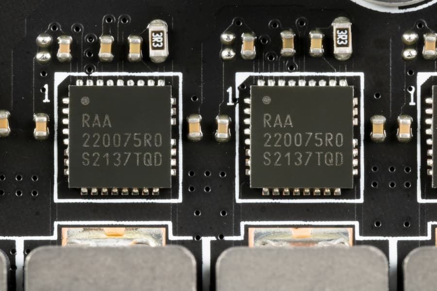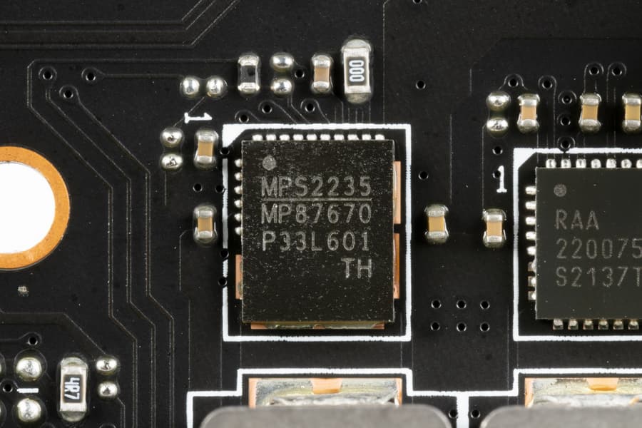 Каждый канал фазы имеет суперферритовый дроссель и RAA 220075R0 MOSFET от Renesas на 75 А для VCore и встроенного графического ядра и MP87670 от Monolithic Power Systems для VCCIO на 70А.