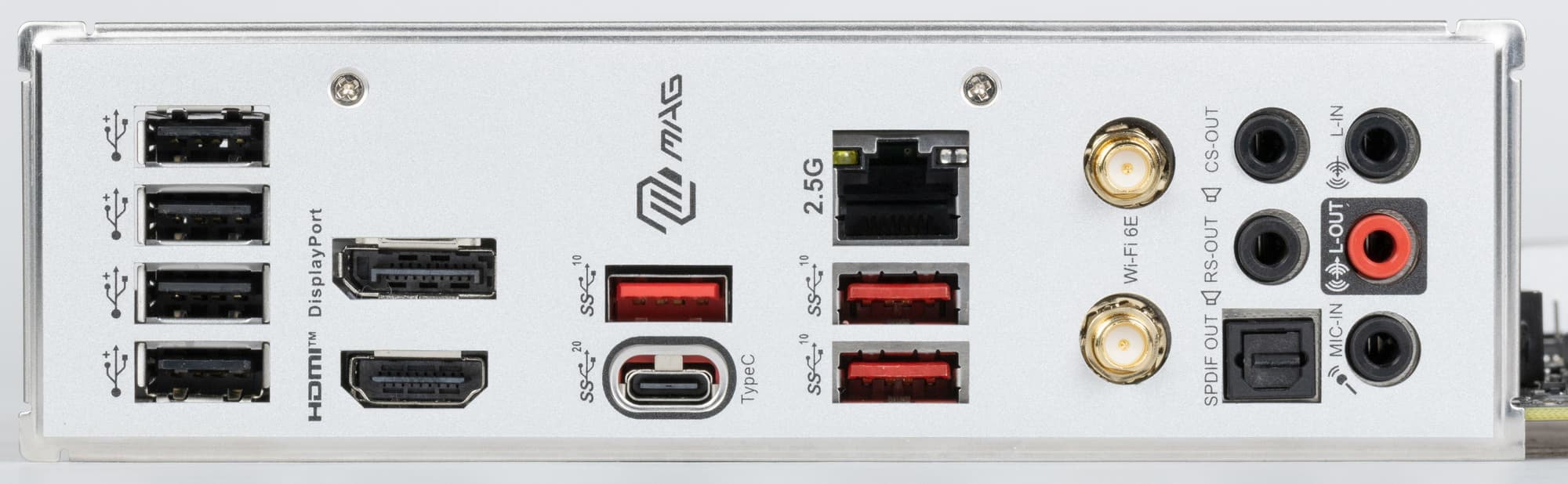 | Разъемы на задней панели | 1 × USB 3.2 Gen2x2 (Type-C) 3 × USB 3.2 Gen2 (Type-A) 4 × USB 2.0 (Type-A) 1 × RJ-45 5 аудиоразъемов типа миниджек 1 разъем S/PDIF 2 антенных разъема 1 разъем HDMI out 1 разъем Display Port out |