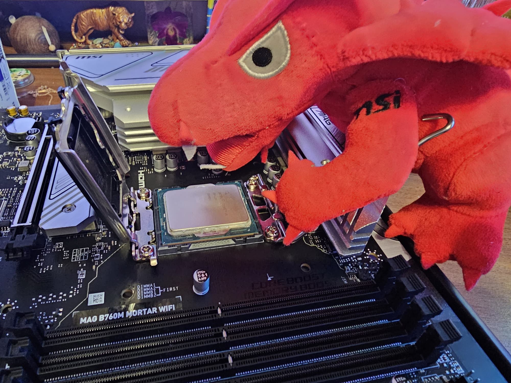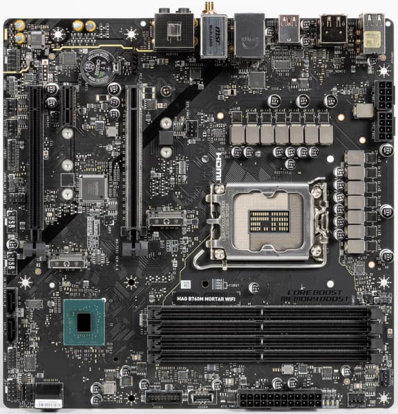 Герой нынешнего обзора — MSI MAG B760M Mortar WiFi. То есть материнка из семейства MAG (MSI Arsenal Gaming), которая относится к самой простой игровой серии (все флагманы — в семействе MEG), ну собственно, просто сам по себе чипсет B760 подразумевает, что материнка с ним как-то будет далека от топовой.