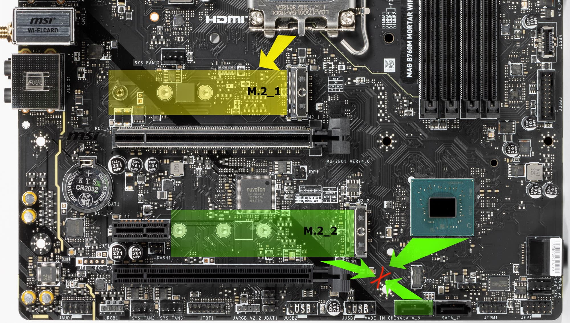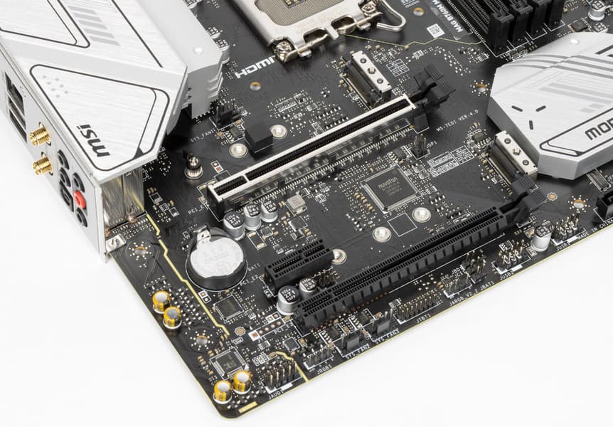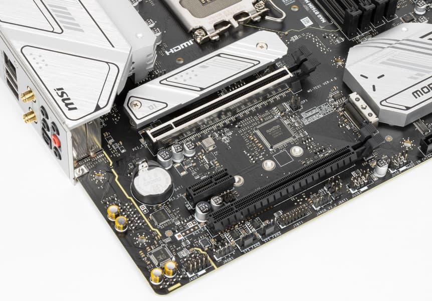 Второй M.2_2 получает данные от чипсета B760, поддерживая PCIe 4.0, при этом модули с SATA интерфейсом также поддерживаются. Первый M.2_1 получает данные от CPU (PCIe 4.0) и работает с модулями только с PCIe интерфейсом. Оба слота поддерживают размеры модулей 2242/2260/2280. На всех M.2 можно организовать RAID. Слот М.2_2 делит ресурсы с портом SATA 8: при использовании в М.2_2 накопителя с SATA интерфейсом порт SATA 8 отключен.