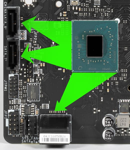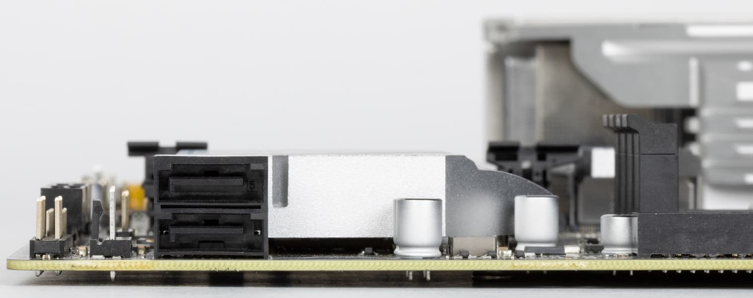 Стоит обратить внимание на то, что порты SATA сгруппированы в два расположения: 2 порта (горизонтально ориентированы) на правом конце платы, и 2 порта (вертикально ориентированы) – на нижнем конце платы.