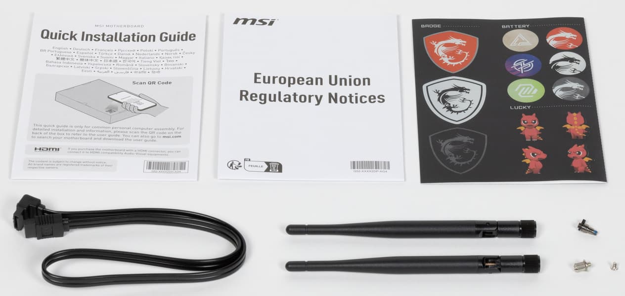 Комплект поставки скромен, как и положено в линейке MAG: кроме традиционных элементов типа руководства пользователя и кабелей SATA, имеются антенны встроенного Wi-Fi-модуля, винтики для М.2 слотов, бонусные стикеры.