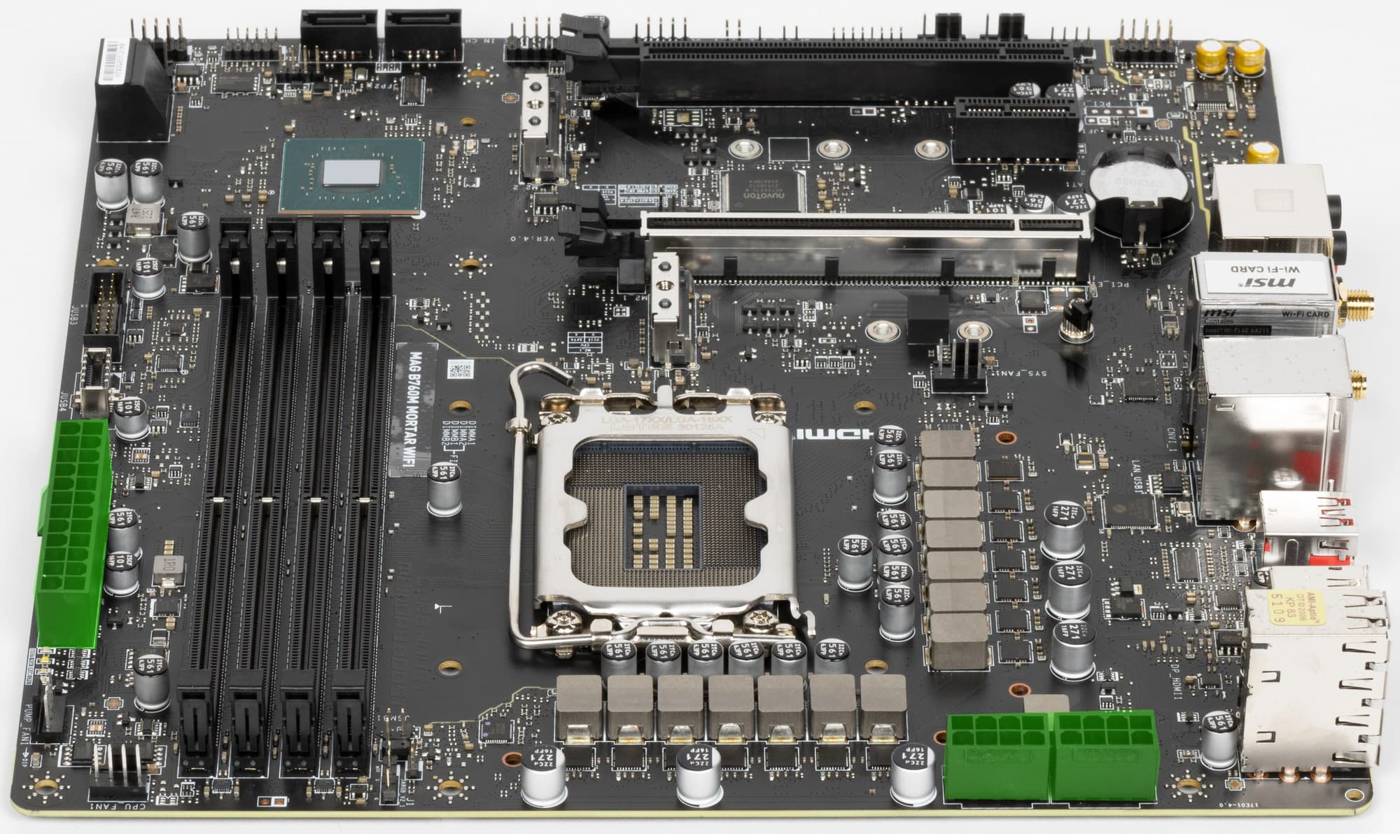 Форм-фактор Micro-ATX имеет размеры 244×244 мм, ATX до 305×244 мм, а E-ATX — до 305×330 мм. Материнская плата MSI MAG B760M Mortar WiFi выполнена в форм-факторе Micro-ATX, имеет размеры 244×244 мм, и на ней имеются 8 монтажных отверстий для установки в корпус.