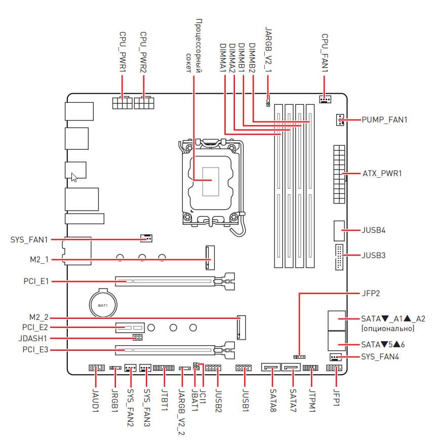 | Разъемы для накопителей | 4 × SATA 6 Гбит/с (B760) 1 × M.2 (M.2_1, CPU, PCIe 4.0 x4 для устройств формата 2242/2260/2280) 1 × M.2 (M.2_2, B760, PCIe 4.0 x4/SATA для устройств формата 2242/2260/2280) |