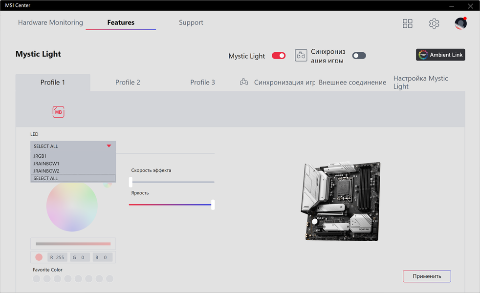 Формально имеется поддержка памяти DDR5 до 4800 МГц, однако всем хорошо известно, и производители материнских плат это активно рекламируют: через XMP-профили сейчас можно использовать частоты до 8000 МГц. В частности данная плата поддерживает частоты до 7000 МГц.