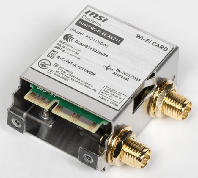 Имеется и комплексный беспроводной адаптер на контроллере Intel AX-211NGW, через который реализованы Wi-Fi 6 (802.11a/b/g/n/ac/ax) и Bluetooth 5.2. Он установлен в слот M.2 (E-key), и его разъемы для привинчивания выносных антенн выведены на заднюю панель.