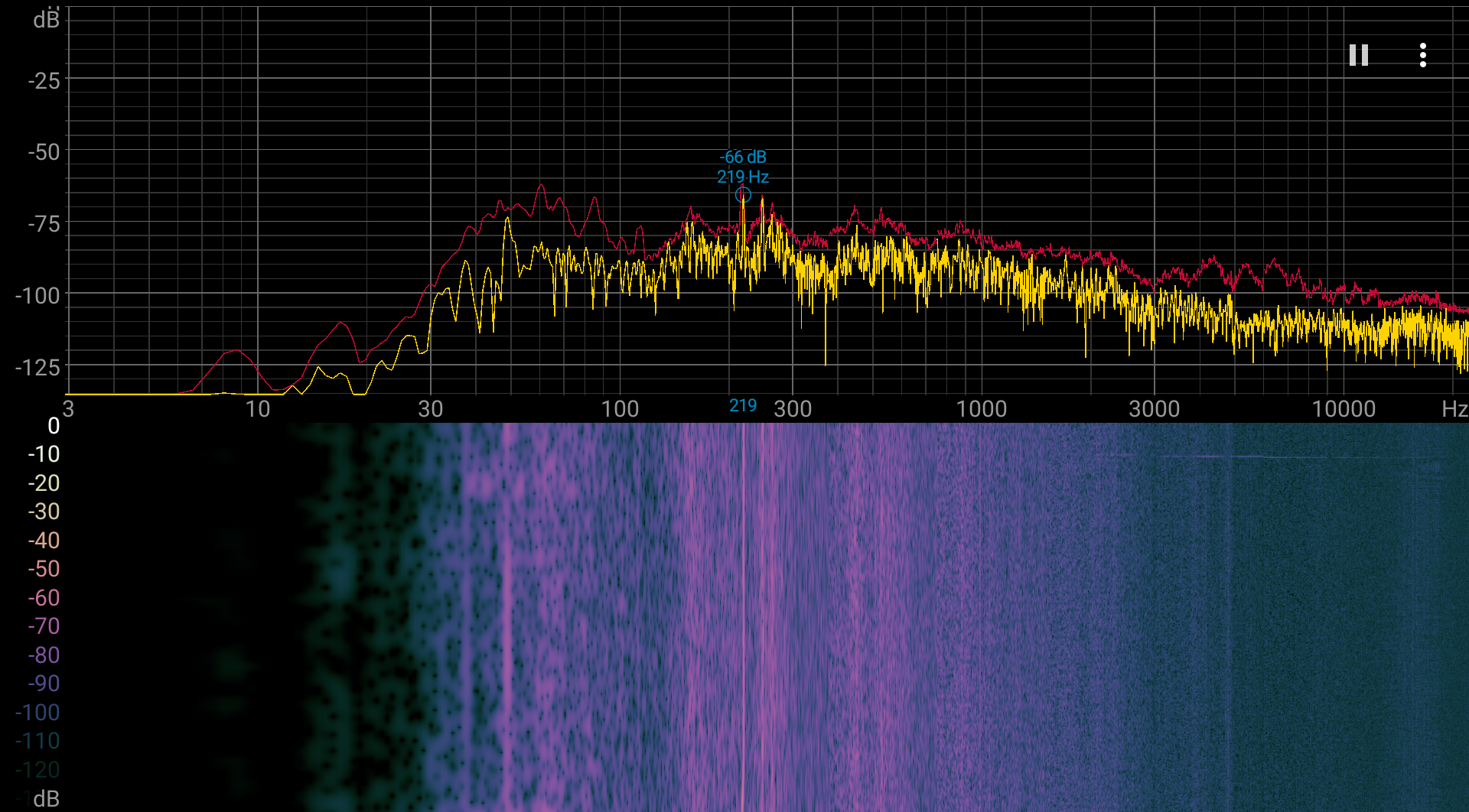 В целом, если сравнивать, например, с типичным игровым ноутбуком, то этот ПК не является шумным устройством. Характер шума особого раздражения не вызывает, хотя какой-то жужжащий призвук присутствует. Спектрограмма, полученная для максимальной нагрузки, достаточно ровная, есть только один выраженный пик (на 219 Гц), но интенсивность его низкая: