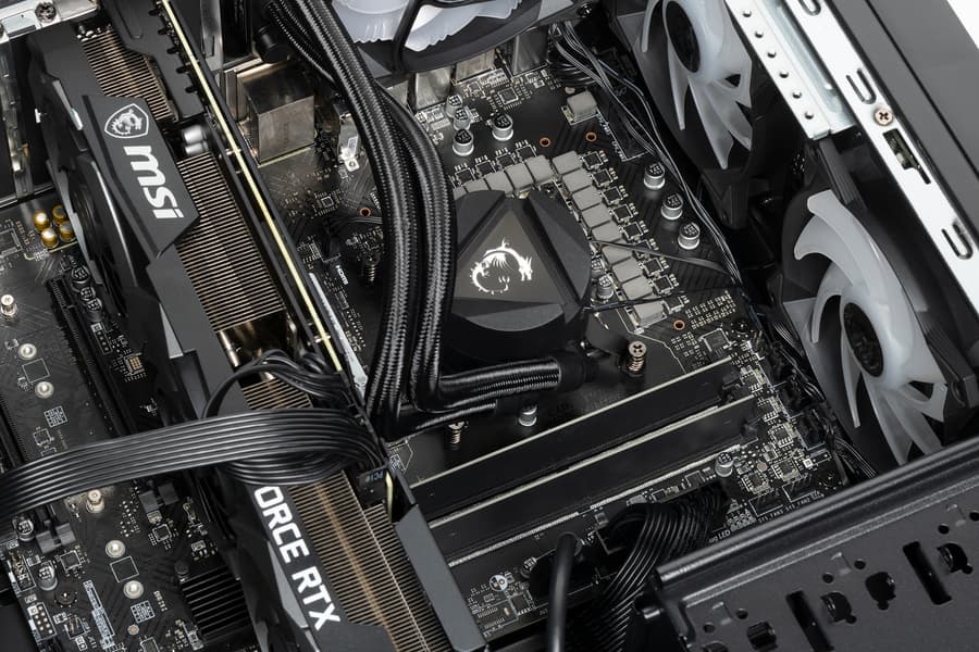 Снимаем крышку, и... Да — опять олдскул. Складывается ощущение, что корпус разрабатывался еще во времена немного других тенденций, так что «осовременили» его позднее просто установкой глухой передней панели. На что прямо намекают три пятидюймовых отсека в верхней части дисковой корзины — которым не помешал бы (раз уж есть) внешний доступ: были бы рады сохранившиеся поклонники оптических дисков, да и всяких интересных устройств под такие отсеки встречалось немало. Но что есть — то есть. Сейчас эти отсеки можно использовать разве что для установки дополнительных жестких дисков, что не слишком удобно, поскольку требует адаптеров. Да и не слишком нужно — и без того отсеков больше, чем может понадобиться современному пользователю. Даже очень требовательному — поскольку нижняя часть позволяет разместить пять трехдюймовых накопителей, а средняя — еще пять двухдюймовых. Столько SATA-портов на современных платах уже не бывает, так что для полной реализации потенциальных возможностей без дополнительных контроллеров никуда. При этом несъемная и неразборная корзина такой конструкции добавляет корпусу жесткости, но может помешать установке очень длинных видеокарт — максимум тут «впихнуть» получится 320 мм, чего достаточно для референсной RTX 4090, но большинство видеокарт собственного дизайна всех производителей длиннее. Даже для RTX 4080 нередки 340 мм — не войдут. И собственной MSI GeForce RTX 4080 16GB Ventus 3X, самую малость не хватает — ее длина 324 мм. Есть, правда, в ассортименте компании RTX 4090 с жидкостным охлаждением — достаточно короткие, чтобы поместиться здесь. Поэтому на что в будущем проапгрейдить видеосистему найдется, но, если бы не немного архаичная компоновка корпуса, выбор мог бы быть гораздо шире. Зато любители SATA-накопителей будут довольны. А для предпочитающих современные решения, а не наследие патриархальной старины, на системной плате есть целых четыре слота М.2, три из которых поддерживают PCIe Gen4. Так что в игровом компьютере можно и одними ими обойтись.