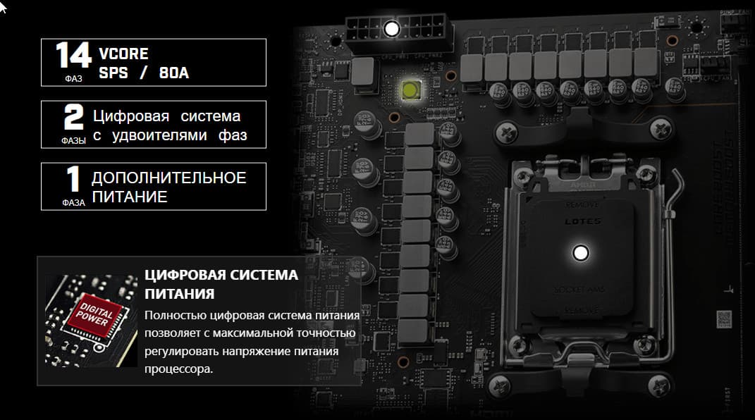 Внешне схема питания выглядит как 14+2+1: 14 фаз — ядро процессора, 2 фазы — SoC (I/O-чиплет Ryzen), 1 фаза — VDD_MISC (вывод встроенной графики).