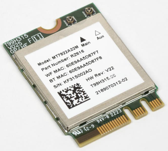 Имеется и комплексный беспроводной адаптер на контроллере MediaTek MT7922A22M (AMD RZ616), через который реализованы Wi-Fi 6E (802.11a/b/g/n/ac/ax) и Bluetooth 5.2. Он установлен в слот M.2 (E-key), и его разъемы для привинчивания выносных антенн выведены на заднюю панель.
