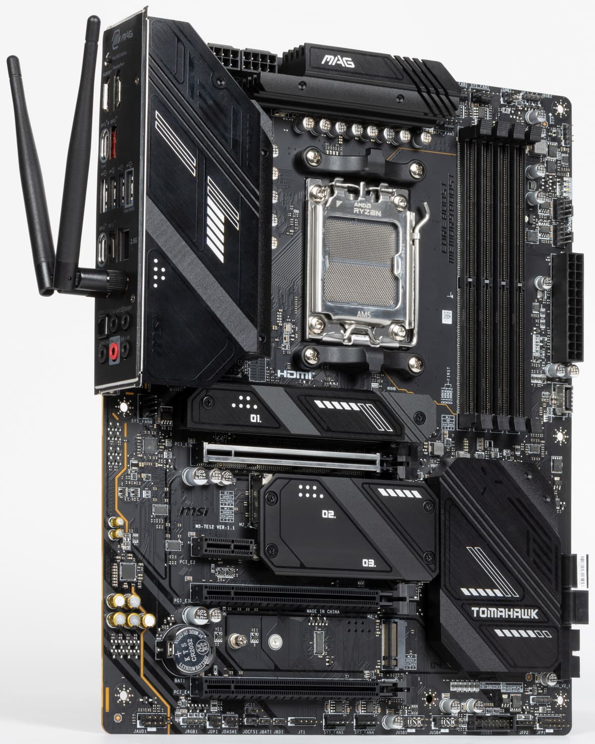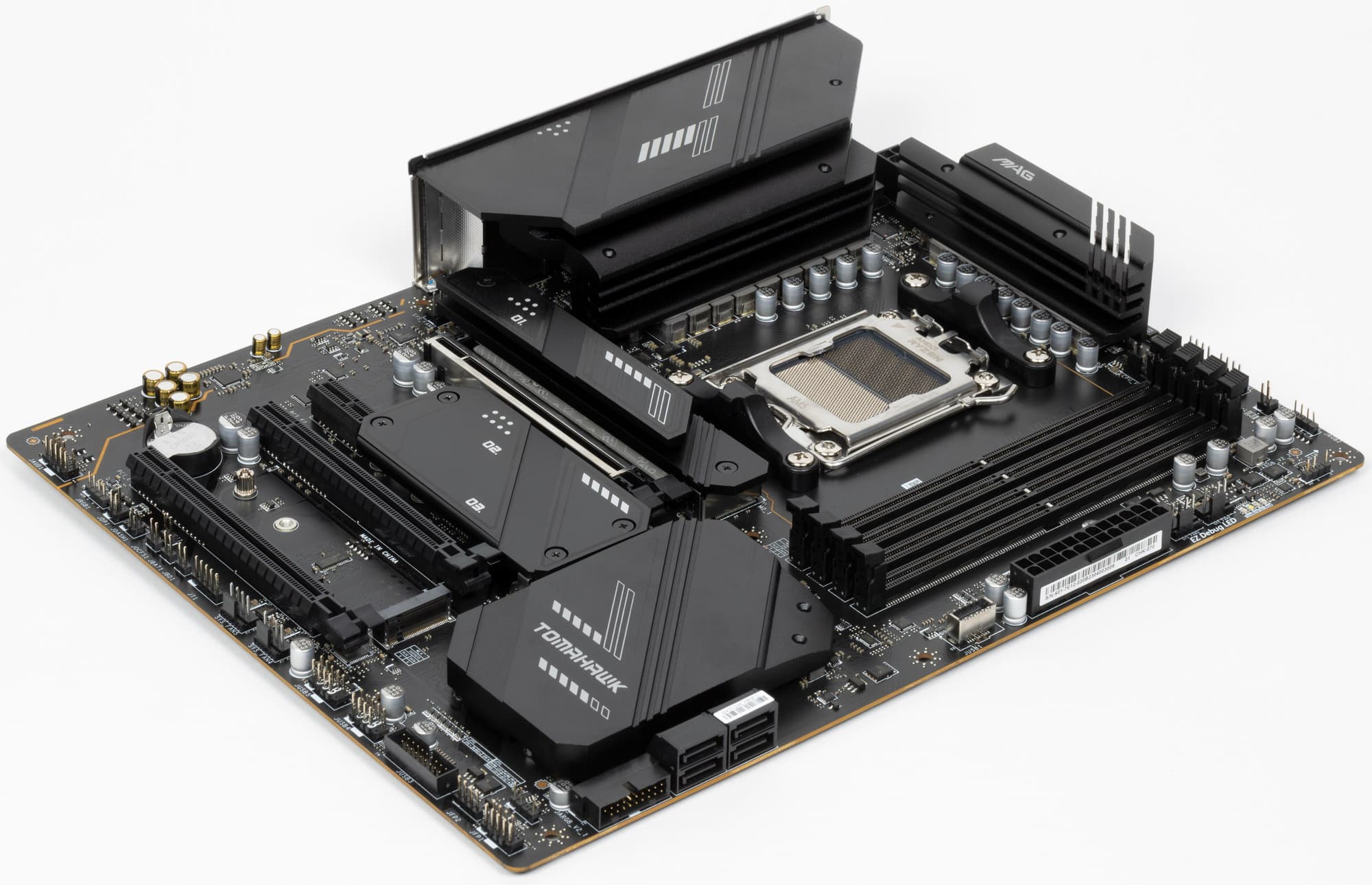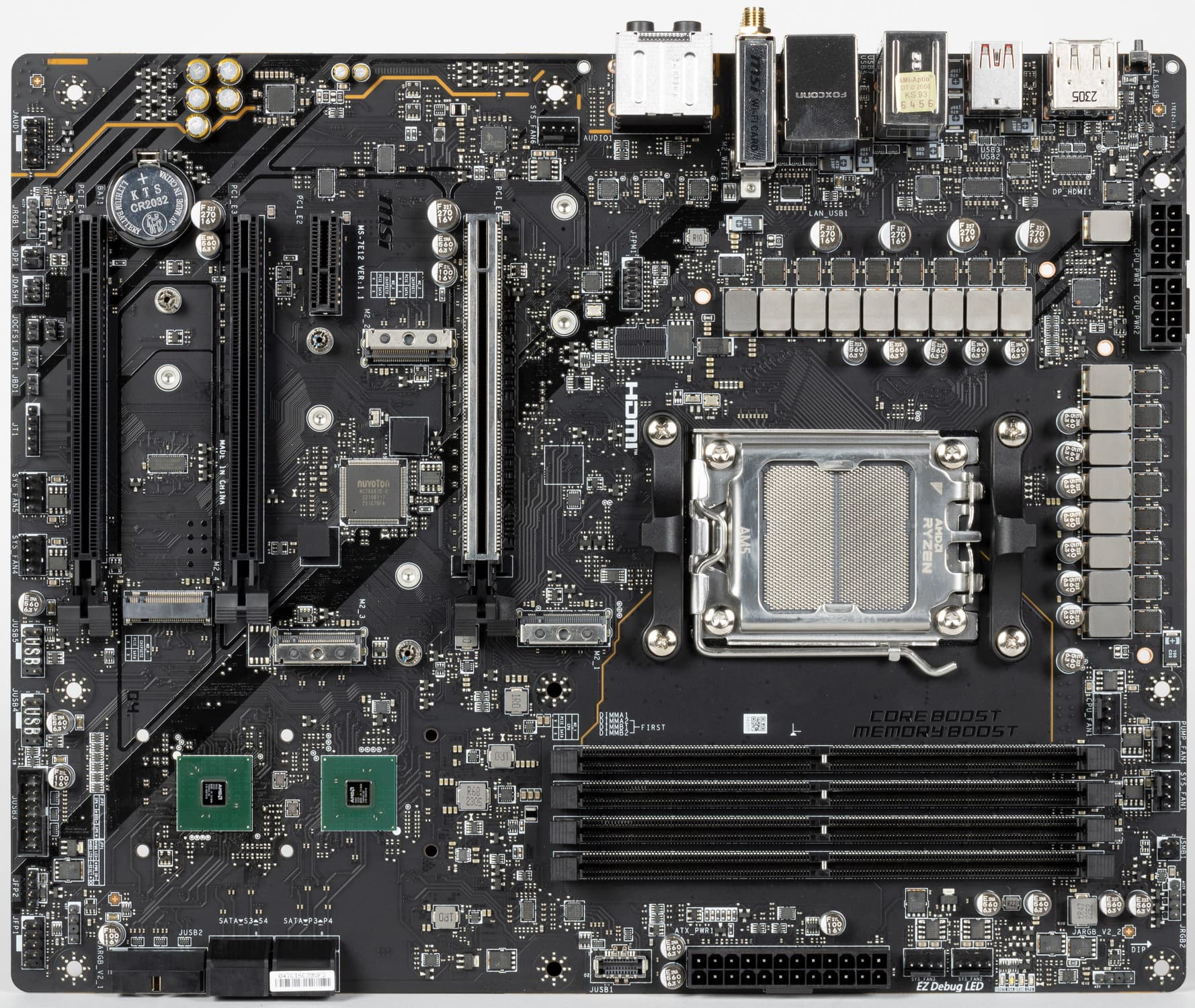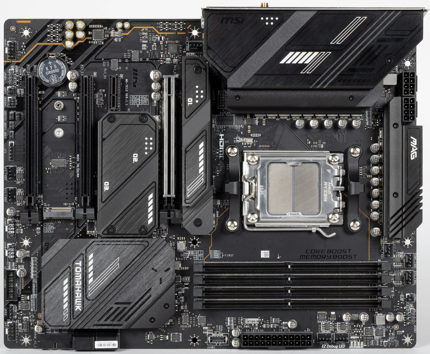 Форм-фактор ATX имеет размеры до 305×244 мм, а E-ATX — до 305×330 мм. Материнская плата MSI MAG X670E Tomahawk WiFi имеет размеры 305×244 мм, поэтому выполнена в форм-факторе ATX, и на ней имеются 9 монтажных отверстий для установки в корпус.