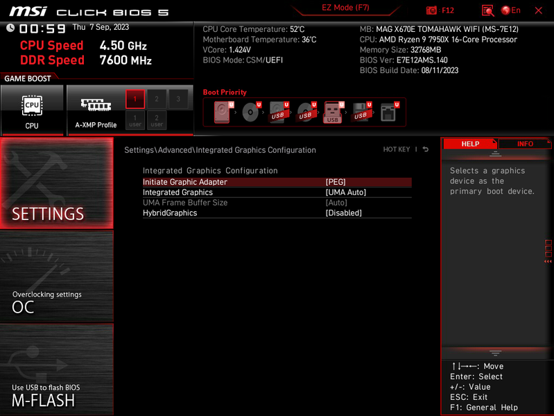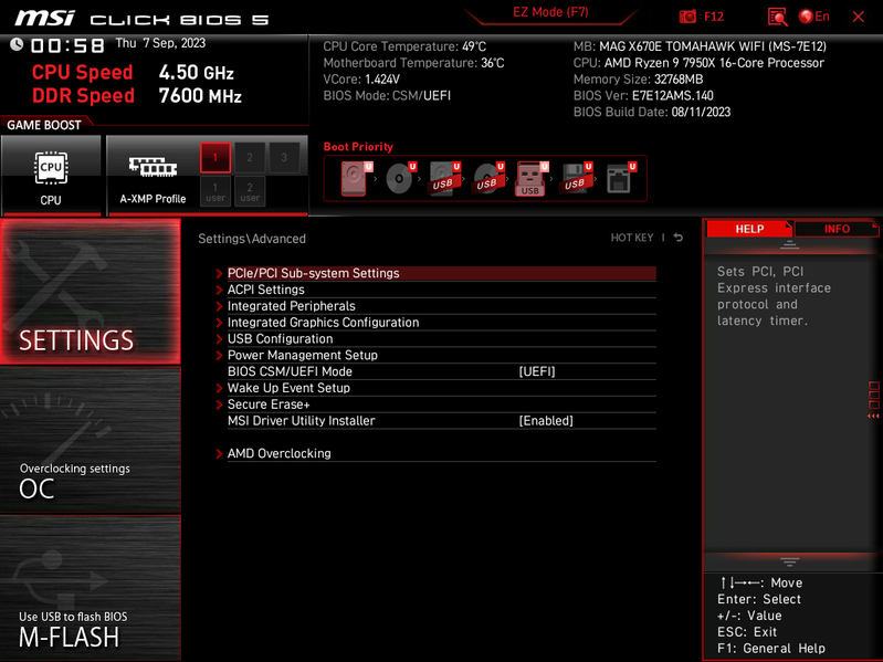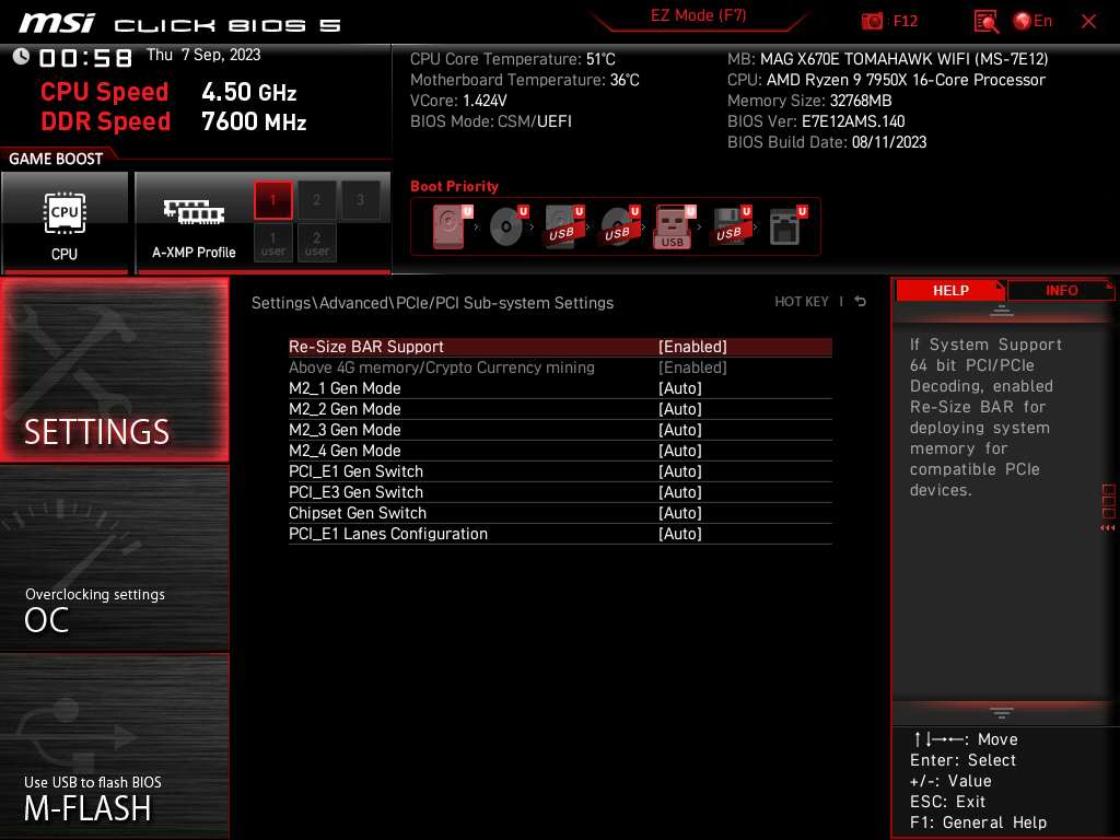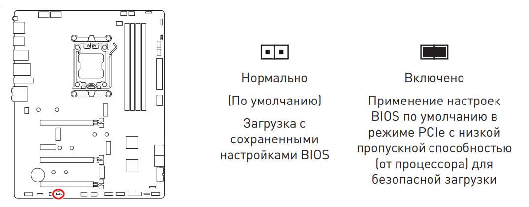 Теперь посмотрим выше на то, как работают процессоры в данной конфигурации. У всех Ryzen 7xxx — 24 линии PCIe (плюс 4 линии на даунлинк с чипсетом). У платы имеется всего один слот PCIe x16_1 (PCI_E1) с поддержкой 16 линий PCIe 5.0, так что перераспределений линий между слотами PCIe 5.0 нет.