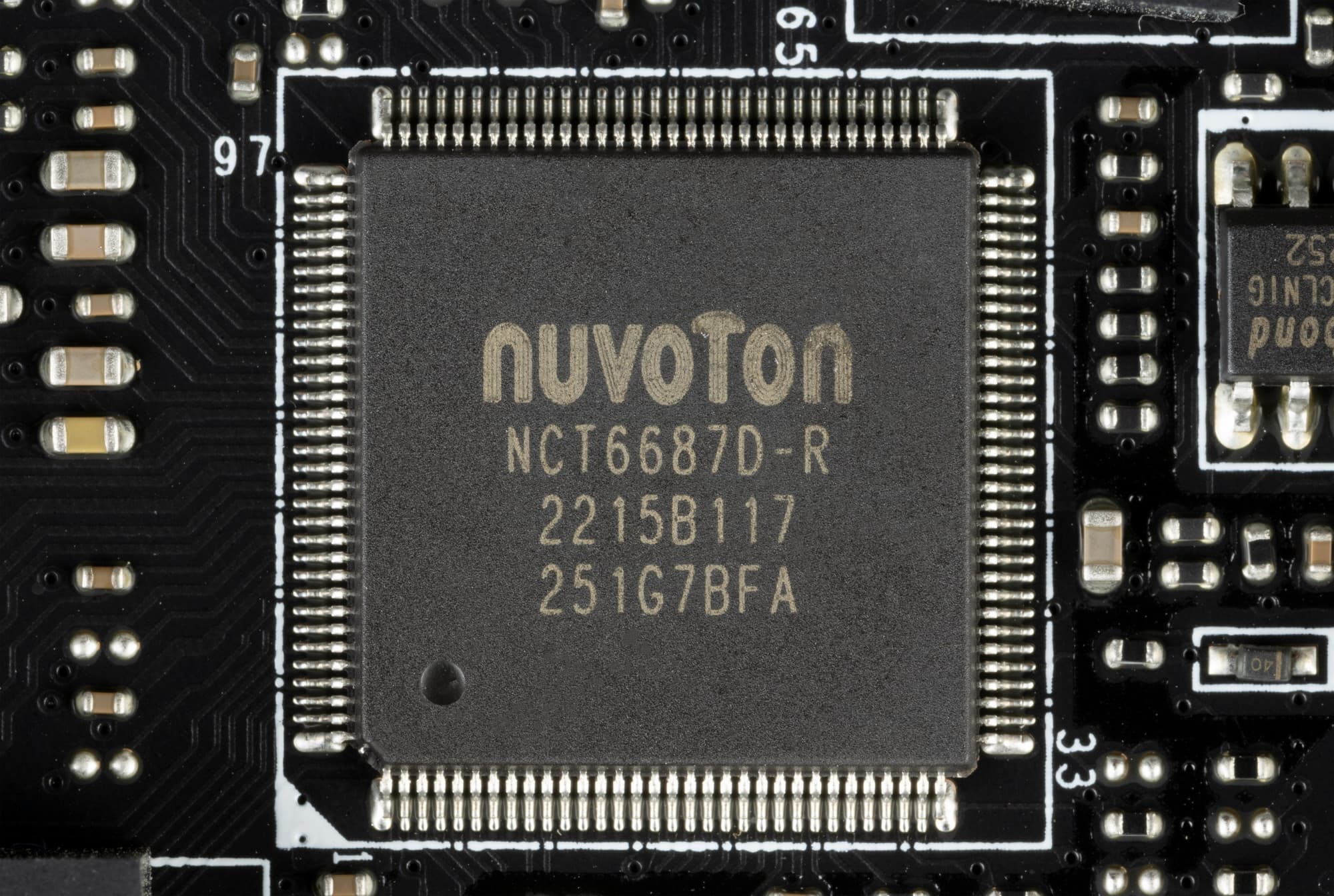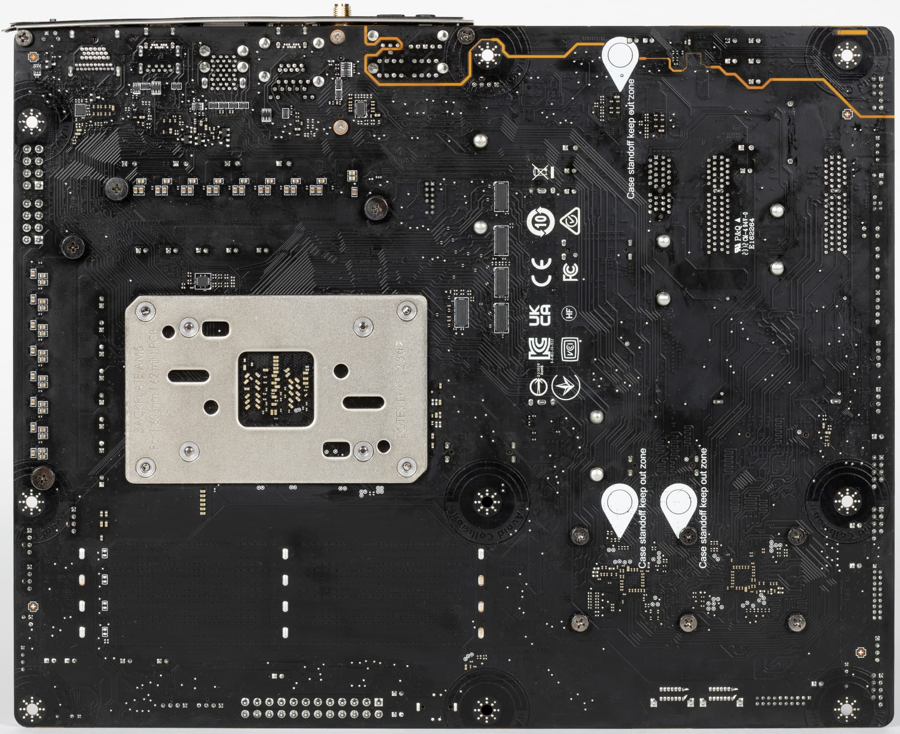 По традиции у всех плат от MSI на оборотной стороне обозначены места, где могут оставаться ненужные в данный момент крепежные втулки (чаще всего латунные), на которые обычно ложится матплата в корпусе, и к которым ее прикручивают. Эти места отмечены белой краской, и нарочно в них нет никаких электропроводных элементов, чтобы в случае установки матплаты не было случайных замыканий или повреждений от лишней крепежной втулки.