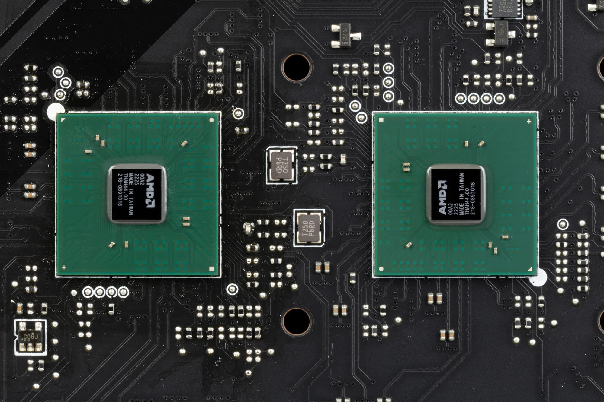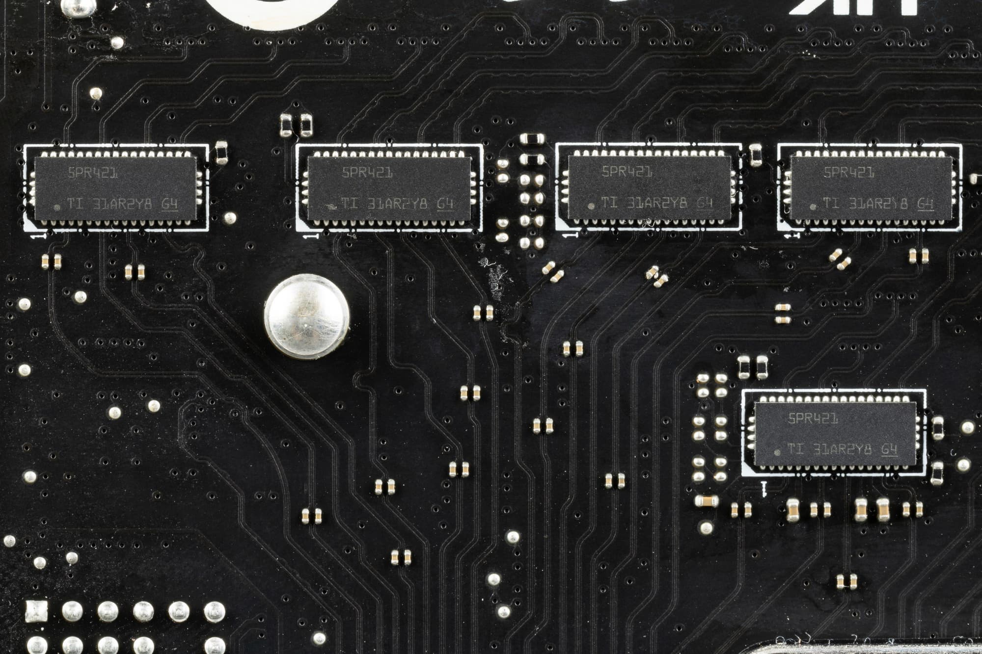 Оборотная сторона — почти пустая, там расположены некоторые элементы логики, включая ре-драйверы шины PCIe 5.0. Текстолит обработан хорошо: во всех точках пайки не только острые концы срезаны, но и все неплохо отшлифовано.