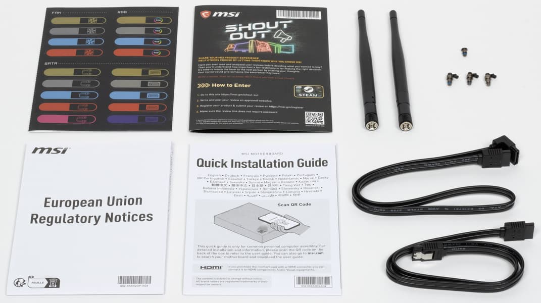 Комплект поставки очень прост: кроме традиционных элементов типа руководства пользователя и кабелей SATA, имеются антенны встроенного Wi-Fi-модуля, дополнительные крепежи для М.2 слотов, бонусные стикеры.