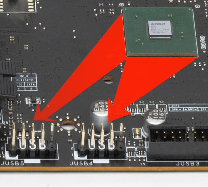 Чипсет X670/X670E получил сильно больше как портов, так и линий PCIe, нежели предшественник, и чтобы не получить одну очень горячую микросхему, памятуя проблему чипсета X570, которому на начальных порах требовался весьма шумный вентилятор, AMD разделила функциональность на две микросхемы по принципу: «восходящее» и «нисходящее» соединения. «Восходящий» чип подключен к процессору через PCIe 4.0 x4, а «нисходящий» к «восходящему» через другое соединение PCIe 4.0 x4. Обе микросхемы произведены силами ASMedia.
